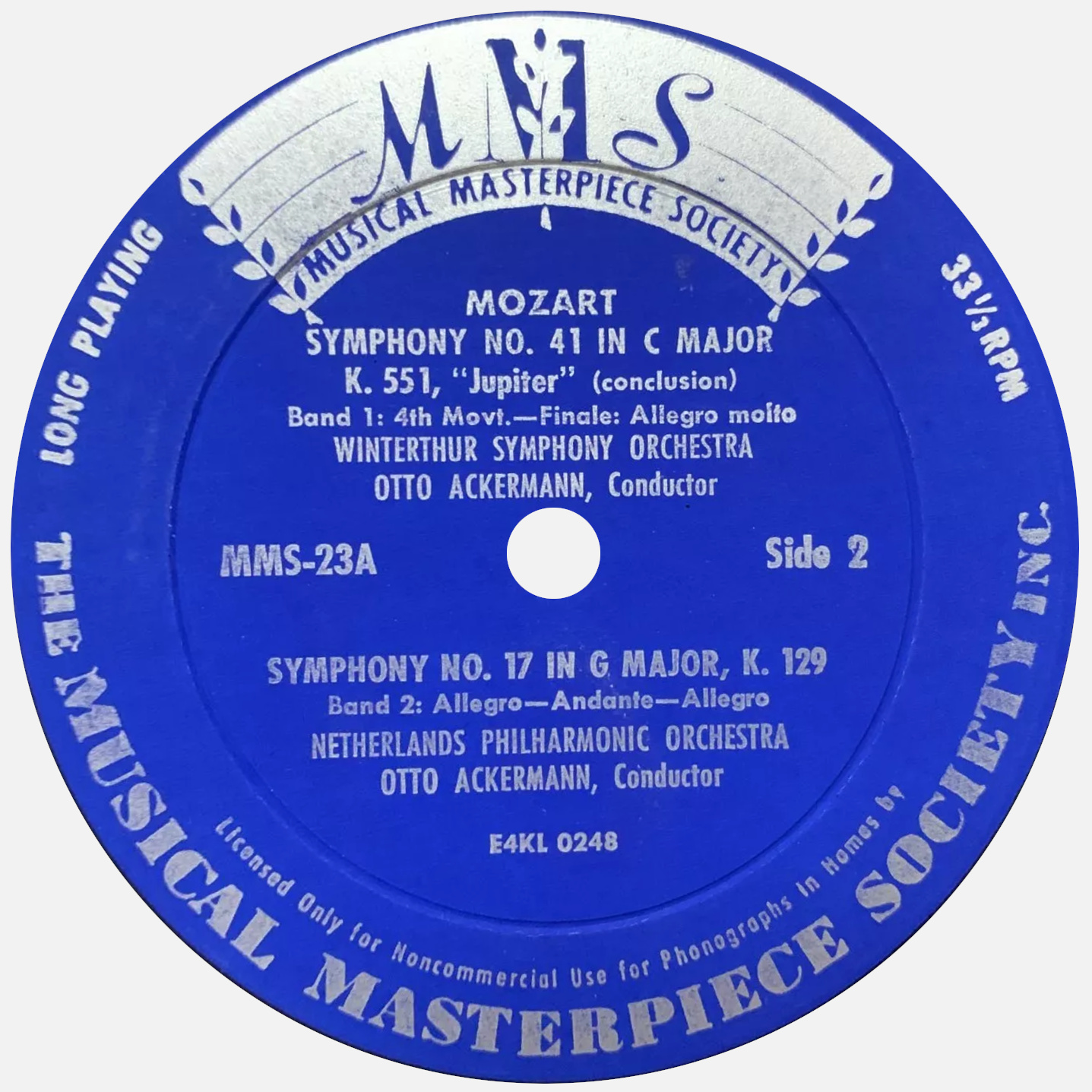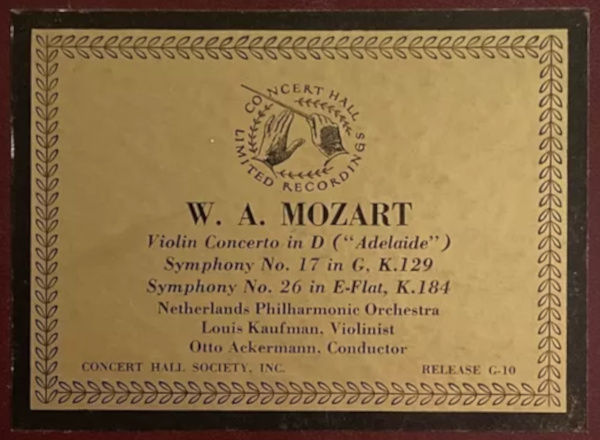 Cet enregistrement fut d'abord publié sur le disque Concert Hall Release G 10, couplé avec deux autres oeuvres de (respectivement attribuée à) Wolfgang Amadeus Mozart, la Symphonie No. 26, KV 184, et le concerto „Adelaïde“, KV Anh. 294a / KV Anh. C 14.05, toutes avec Otto ACKERMANN dirigeant un orchestre nommé „Orchestre Philharmonique Néerlandais“ (voir cette page de mon site pour quelques précisions sur cette formation). Selon cette page du site de la Phonothèque Nationale Suisse, la prise de son date du 21 juillet 1952.