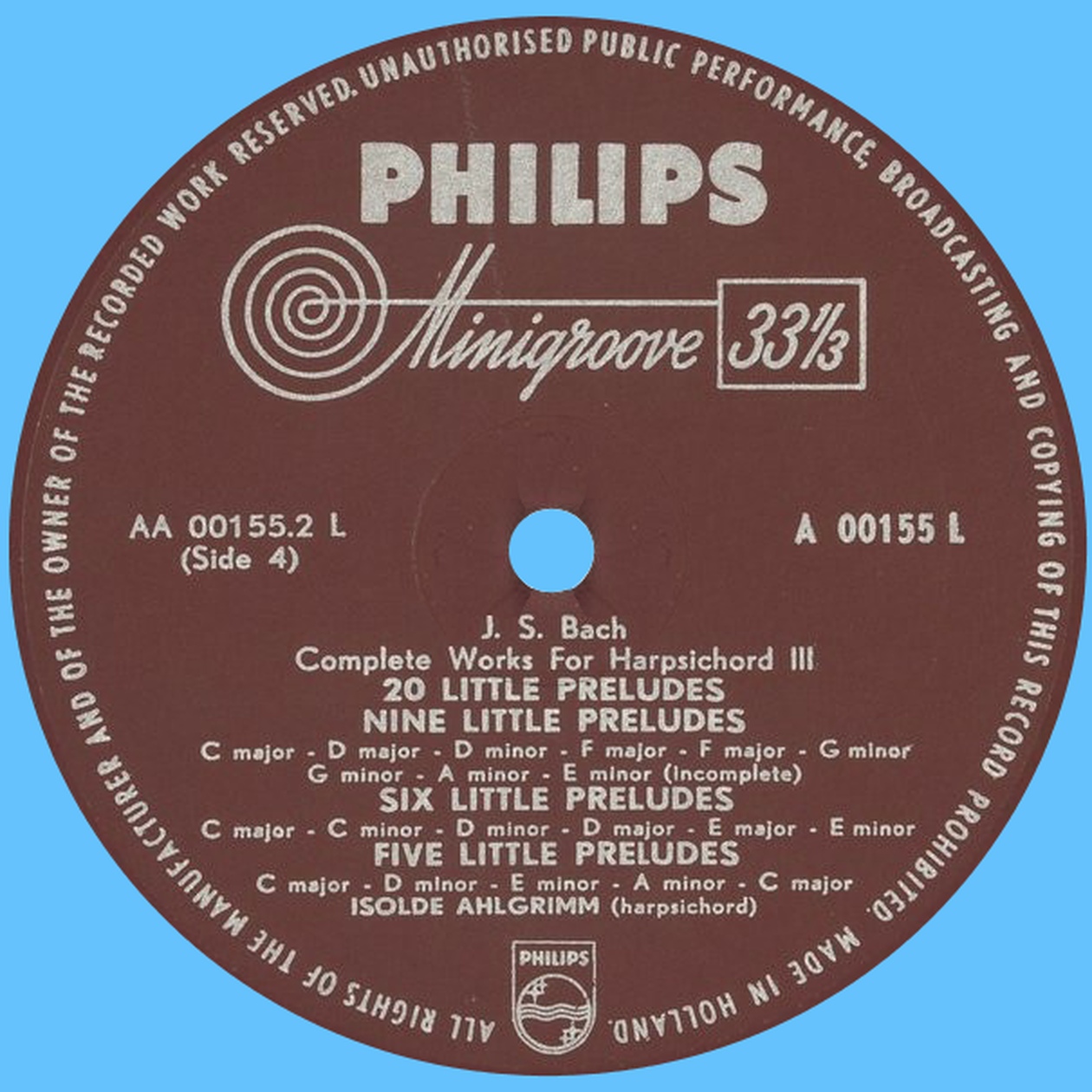 Dans les sessions du 23 au 30 septembre 1952 furent enregistrés les 20 petits préludes BWV 924 à 943, afin de compléter le double album Philips A 00155-56 (avec les Suites Françaises BWV 812 à 817). Isolde Ahlgrimm les joua sur son clavecin à pédales Ammer de 1941: voir à cet endroit de ma première page de cette intégrale pour quelques précisions sur les conditions d'enregistrement. [...]" Gilles Cantagrel, J.-S.Bach - l'oeuvre instrumentale, Buchet-Chastel, ISBN 978-2-283-03113-1