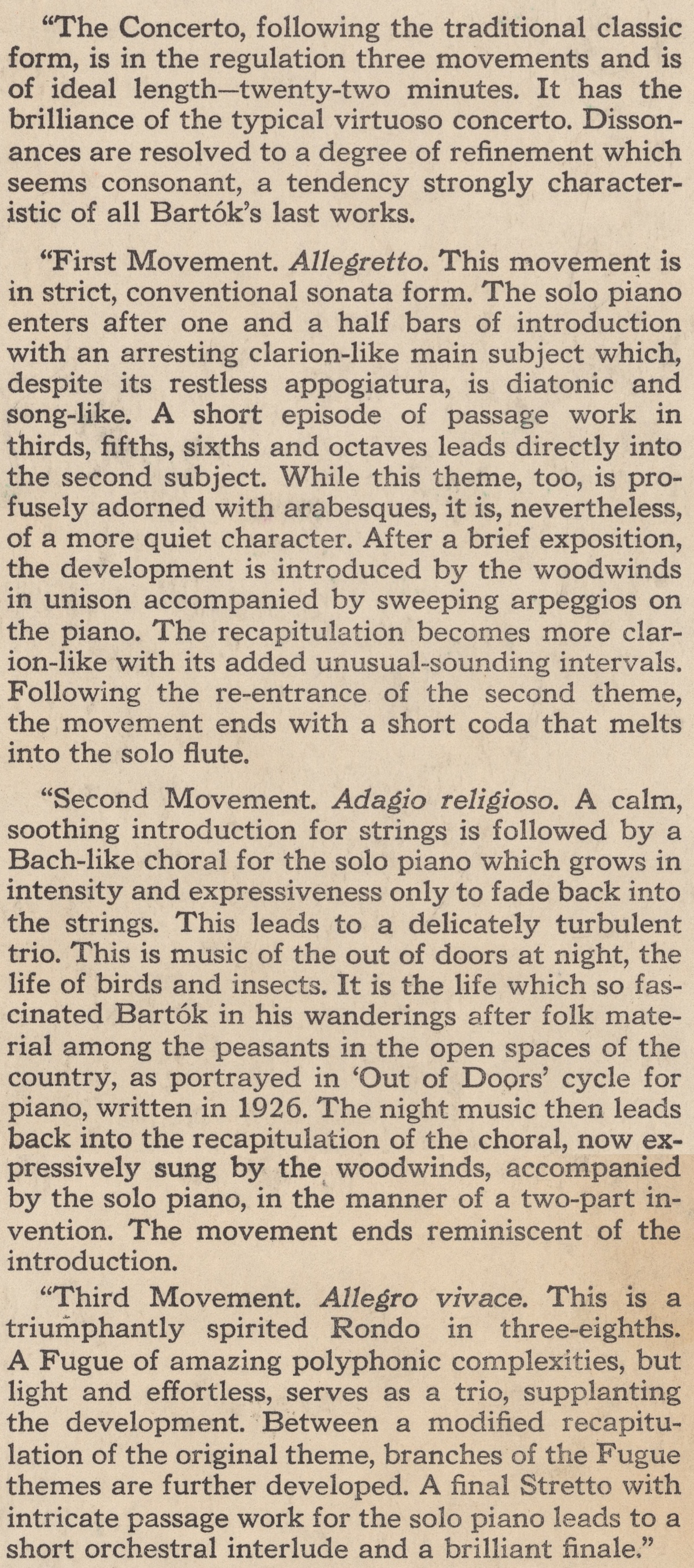 Une courte description des trois mouvements de l'oeuvre, citée d'un texte publié au verso du disque Columbia Masterworks ML 4239, son auteur n'étant pas nommé: