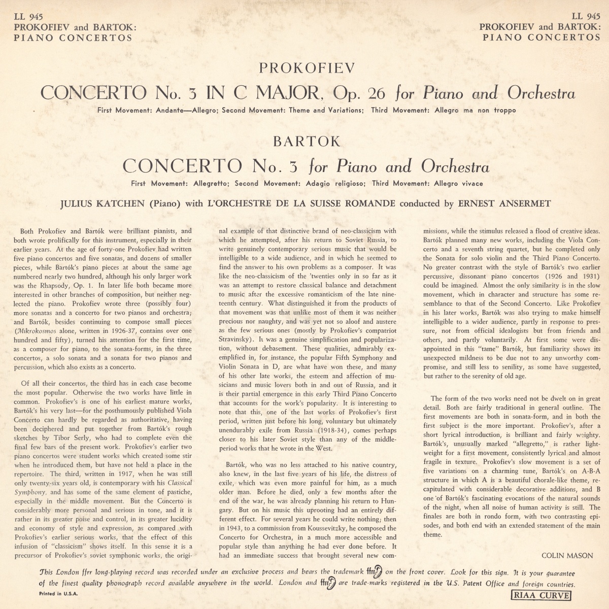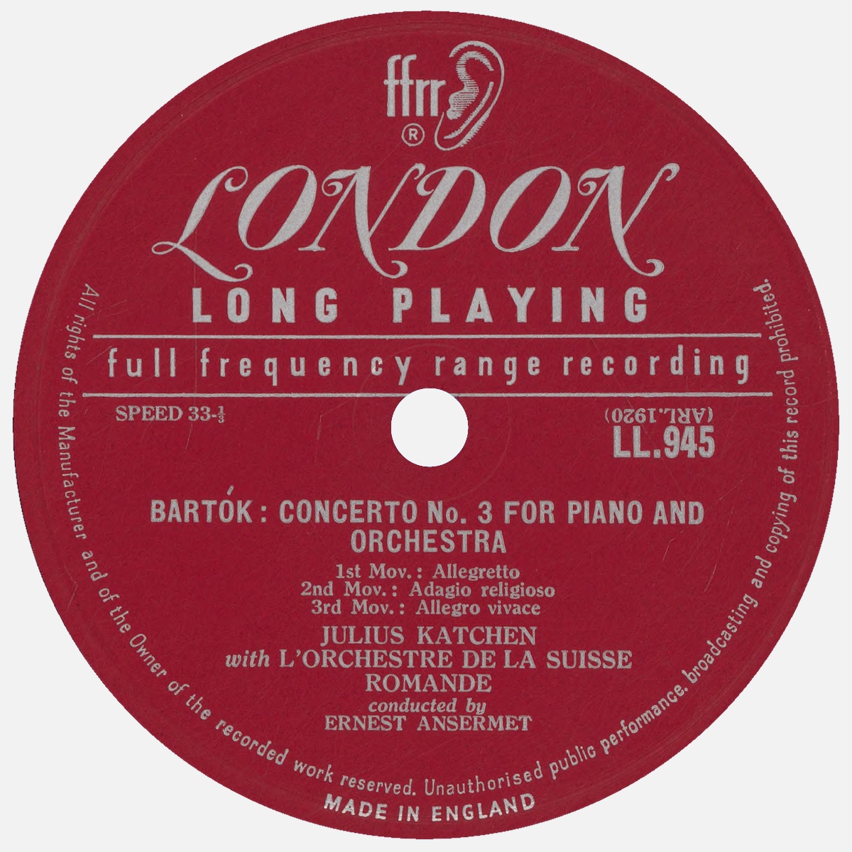 Bela Bartok, Concerto pour piano et orchestre No 3, Sz 119, BB 127, Julius Katchen, Orchestre de la Suisse Romande, Ernest Ansermet, novembre 1953, Victoria Hall, Genève