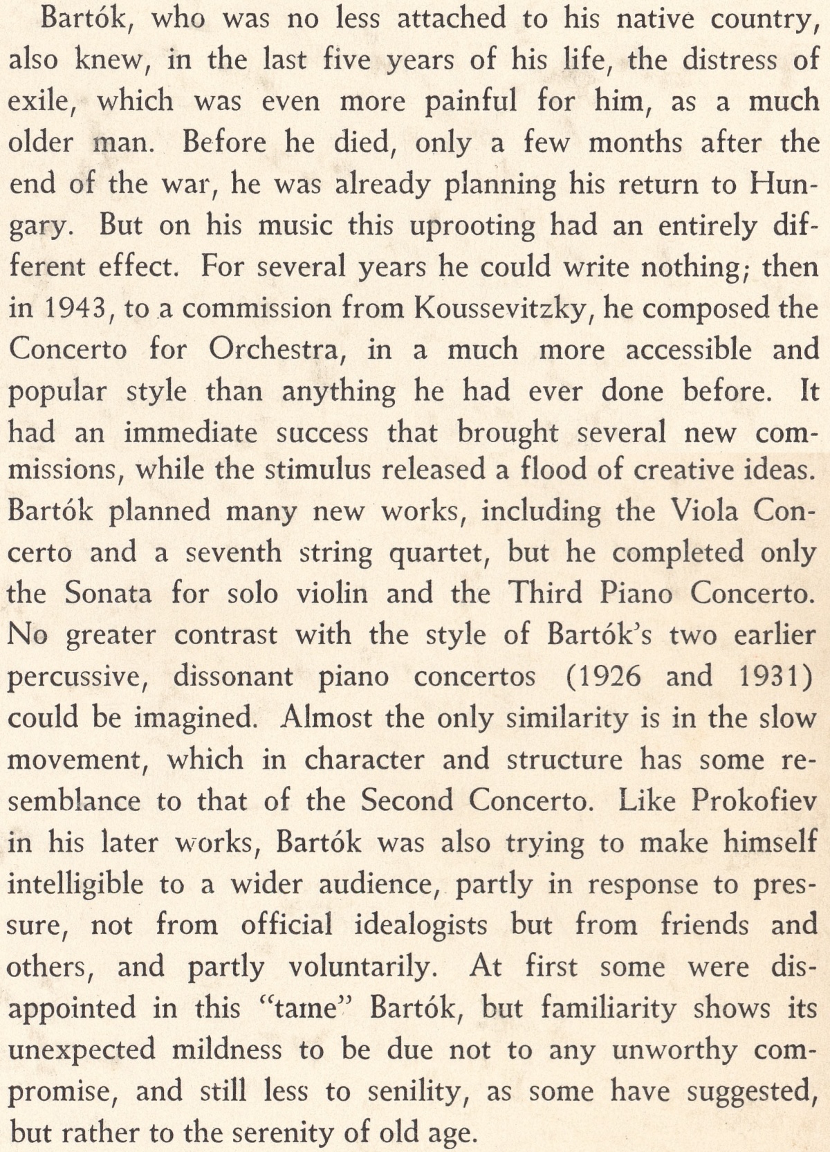 Écrit en 1945, c'est le dernier ouvrage important de Bela Bartok, hélas resté inachevé: les quatorze dernières mesures furent instrumentées par Tibor Serly, le meilleur «disciple» du compositeur, qui l'avait assisté pendant la composition de l'oeuvre.