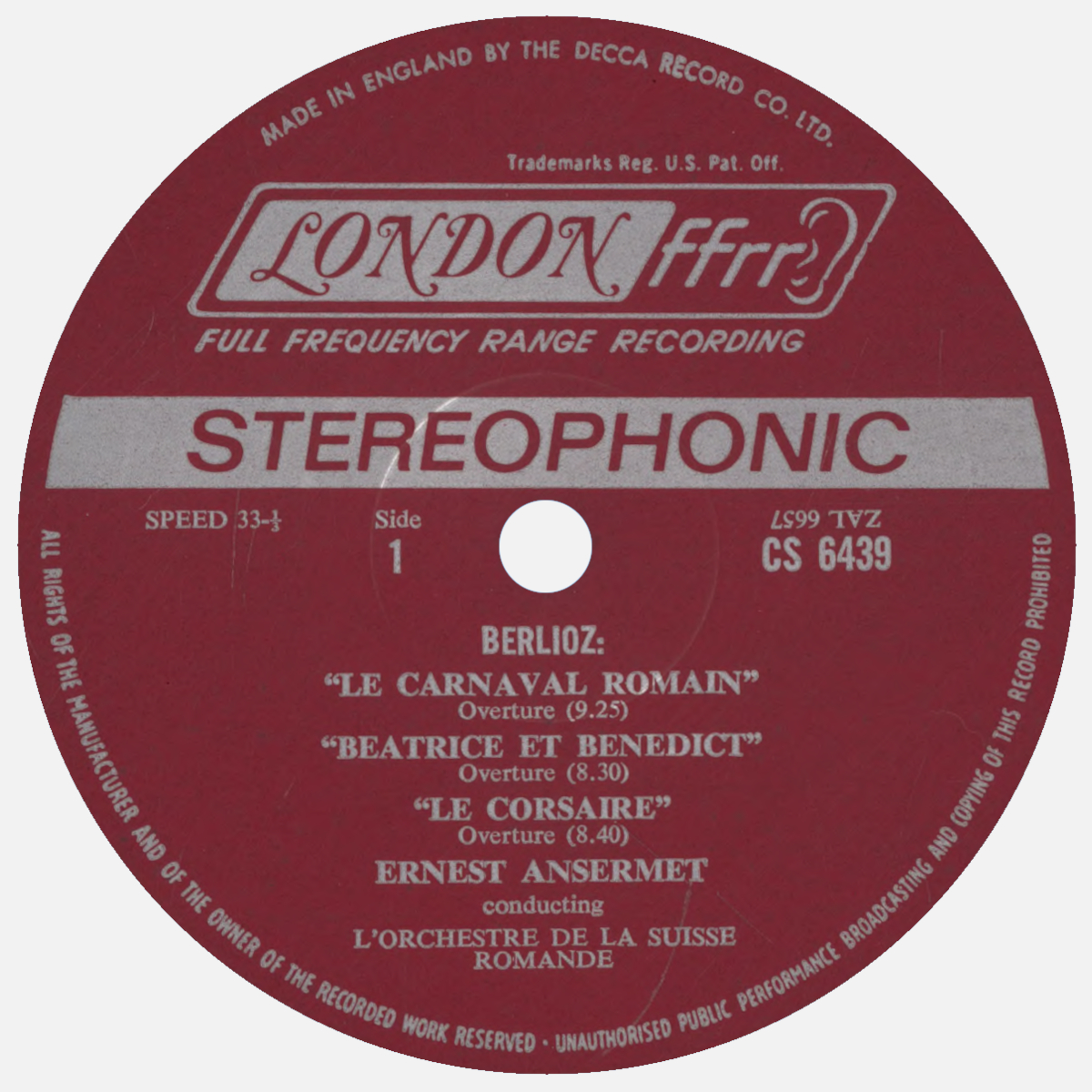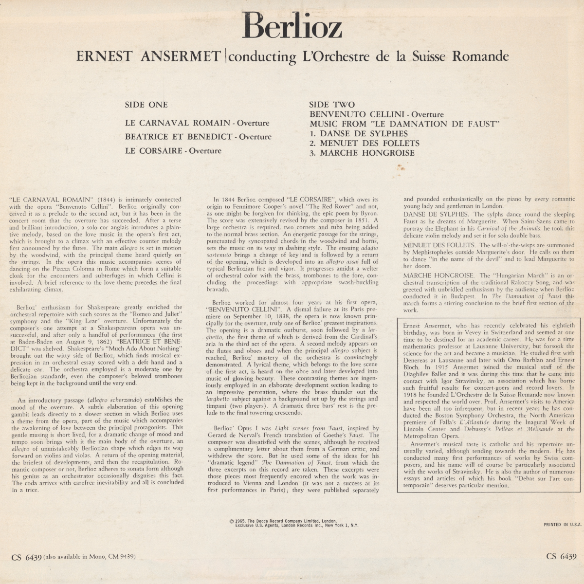 Les 11, 13, 15 et 16 décembre 1964, dans le Victoria Hall de Genève, Ernest ANSERMET et son Orchestre de la Suisse Romande enregistrèrent - bien entendu pour le label Decca - toute une série d'oeuvres composées par Hector BERLIOZ: