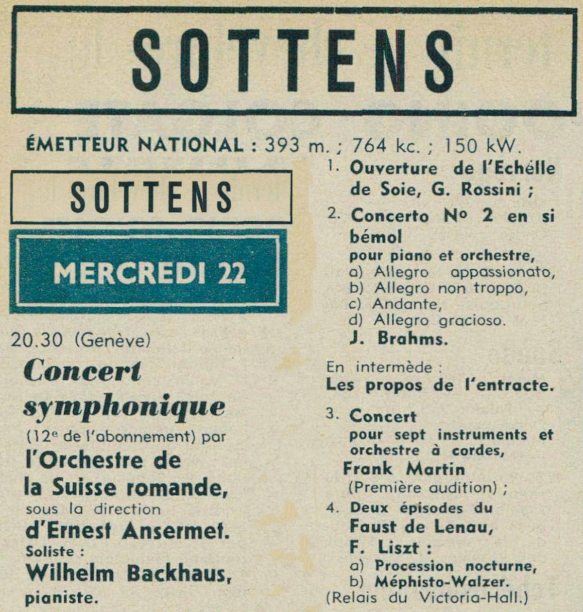Johannes Brahms, Concerto pour piano et orchestre Nr. 2 en si bémol majeur, op. 83, Wilhelm Backhaus, Orchestre de la Suisse Romande, Ernest Ansermet, 22 mars 1950, Victoria Hall, Genève (12e concert de l'abonnement)