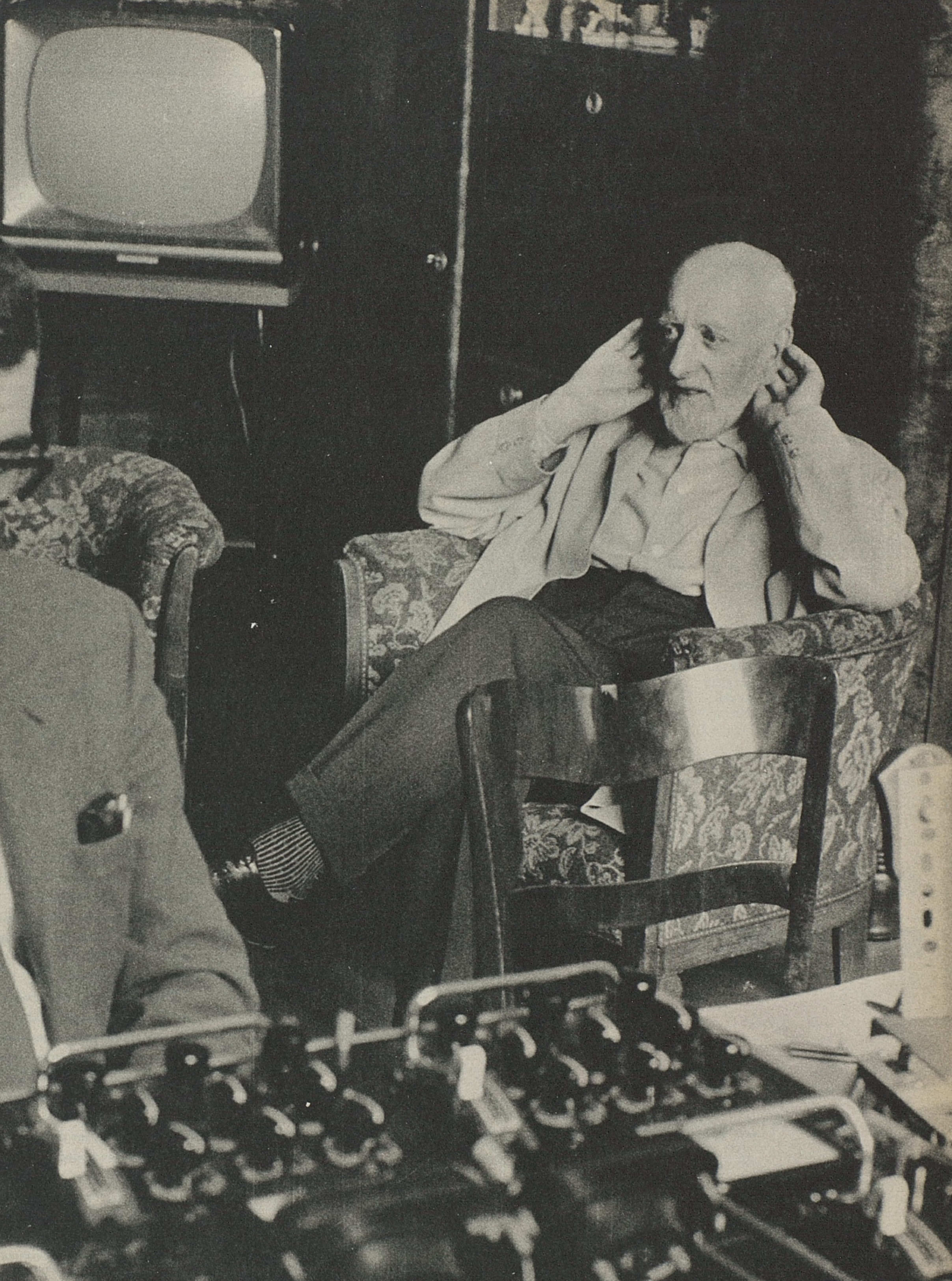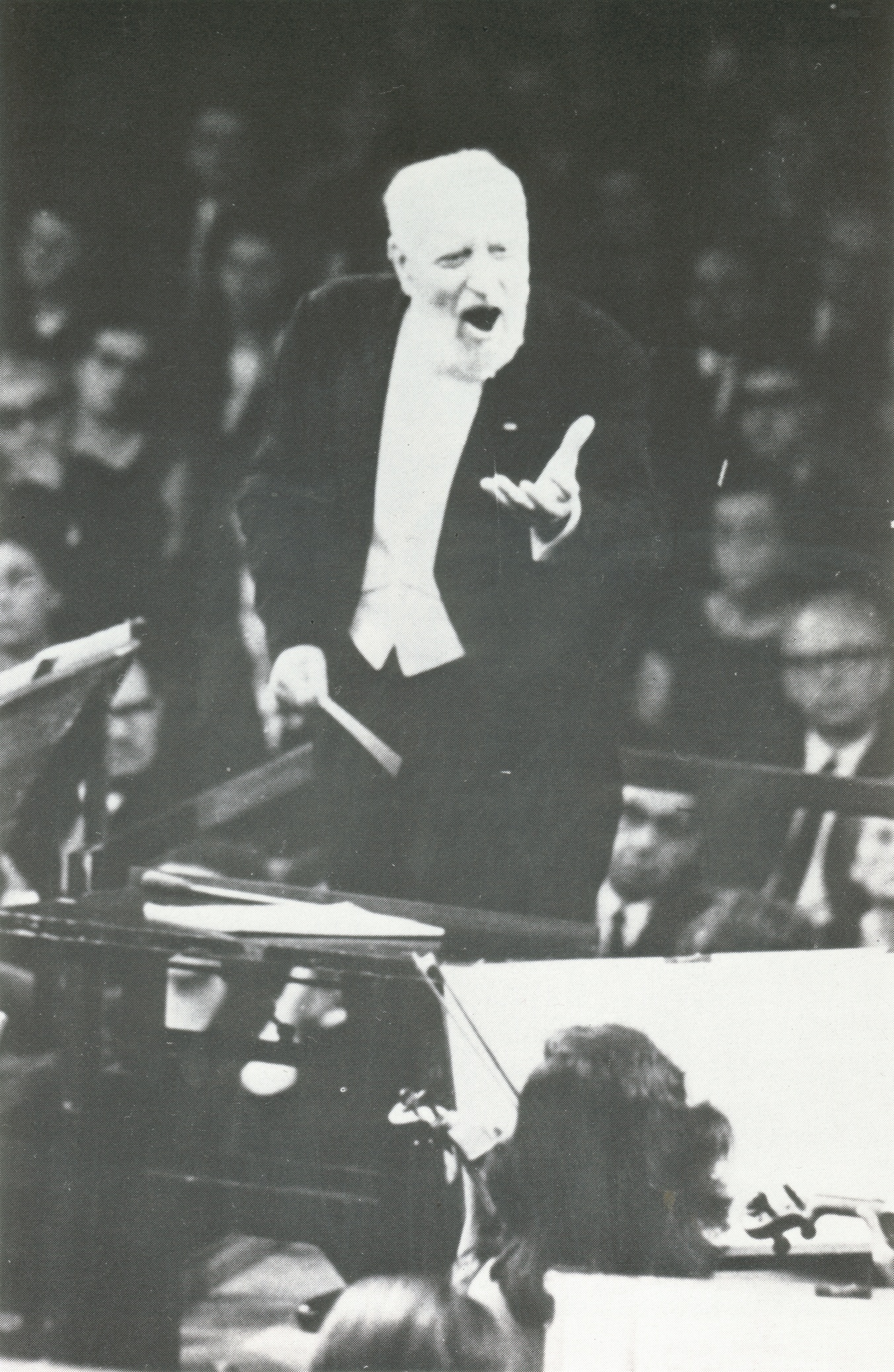 Ernest Ansermet écoute un test d'enregistrement du Chasseur Maudit de César Franck. À l'extrême-gauche Roy Wallace, ingénieur du son de Decca. Une photo faite par Jean Mohr le 25 ou le 26 mars 1961 lors des séances d'enregistrement au Victoria Hall de Genève