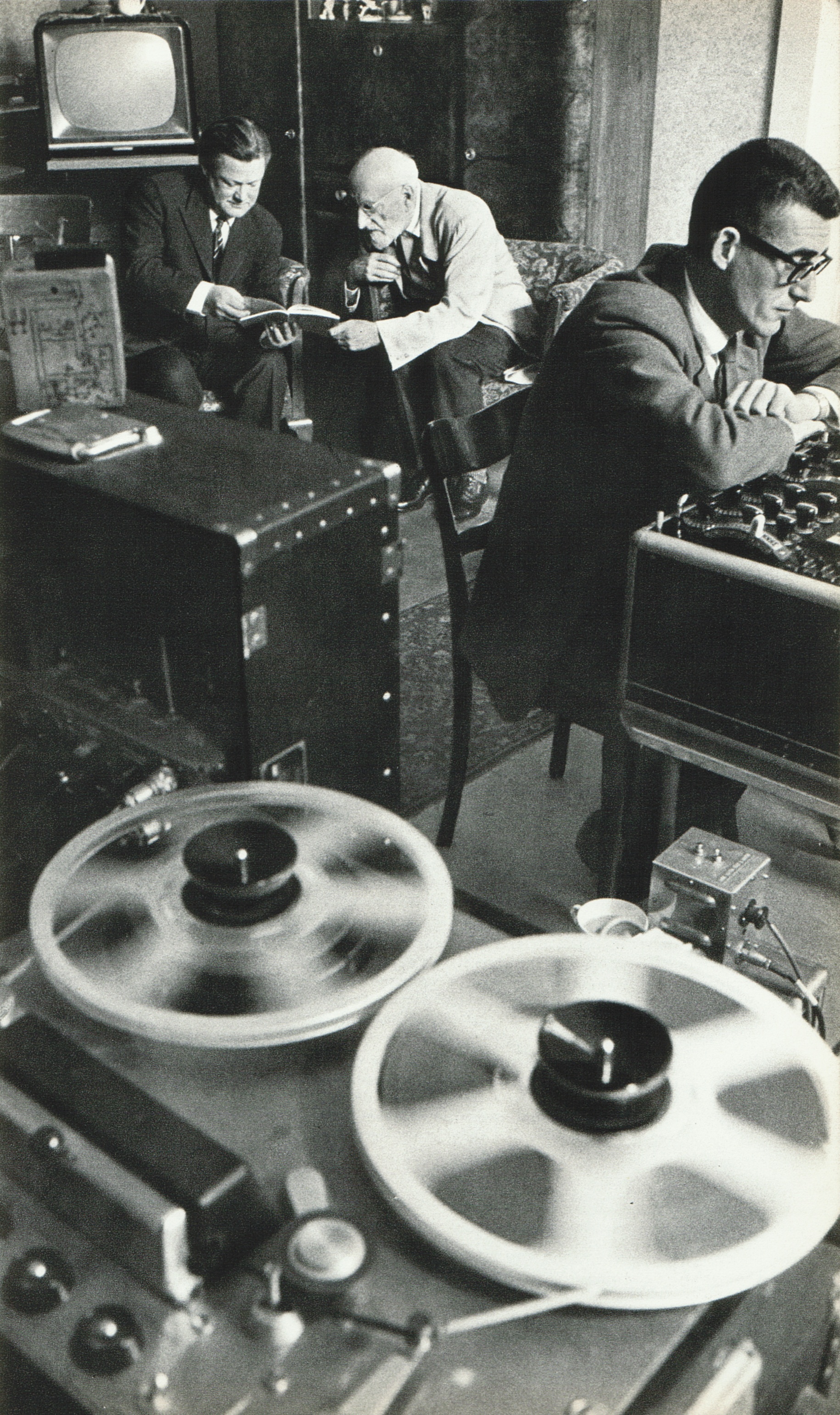 Ernest Ansermet écoute un test d'enregistrement du Chasseur Maudit de César Franck. À gauche James Walker (producteur) et à droite Roy Wallace (ingénieur du son) de Decca. Une photo faite par Jean Mohr le 25 ou le 26 mars 1961 lors des séances d'enregistrement au Victoria Hall de Genève