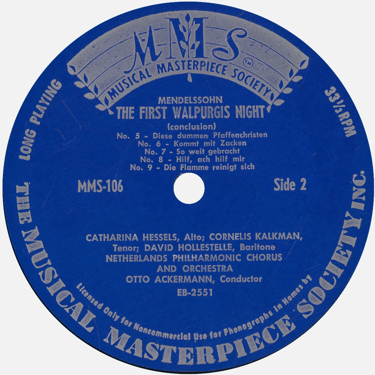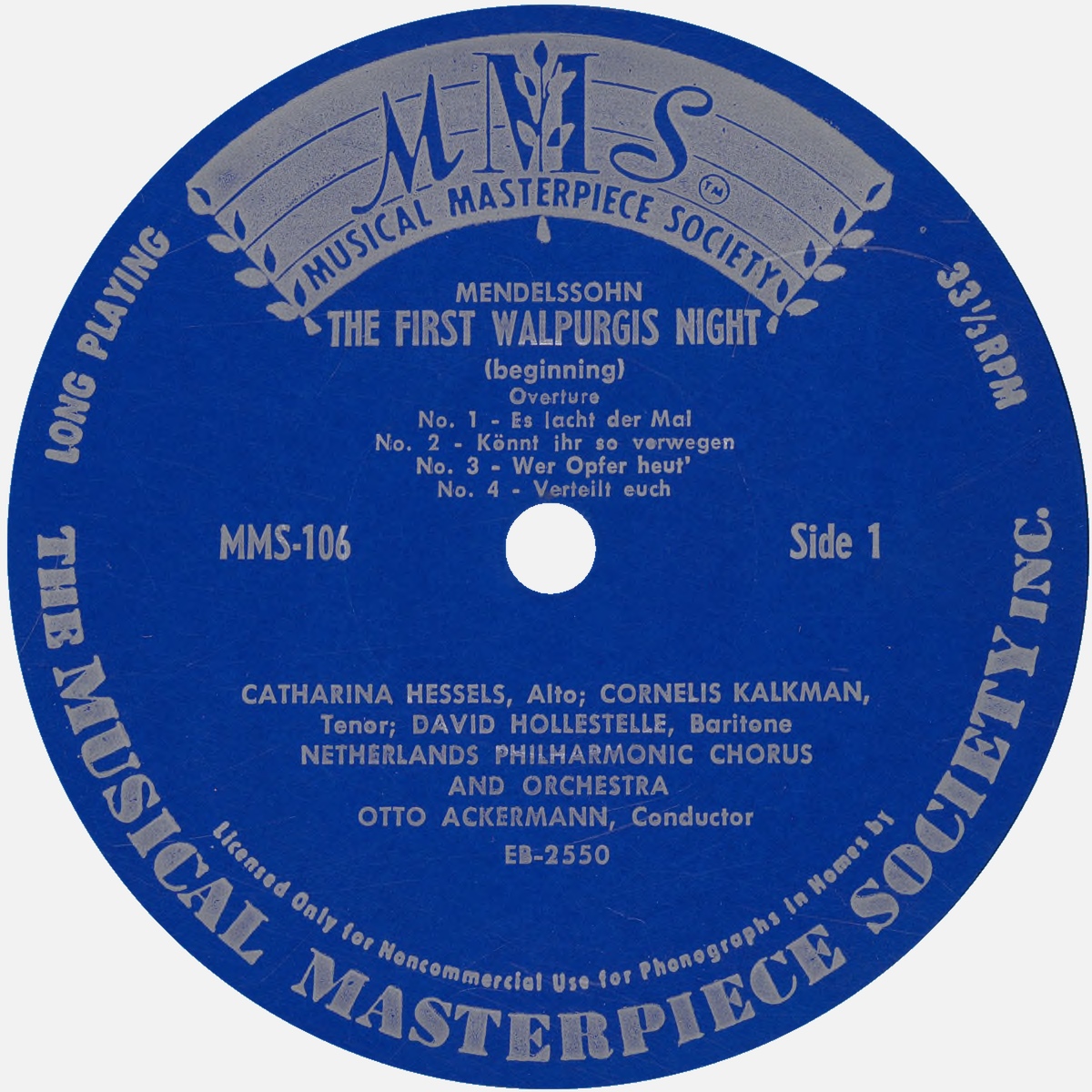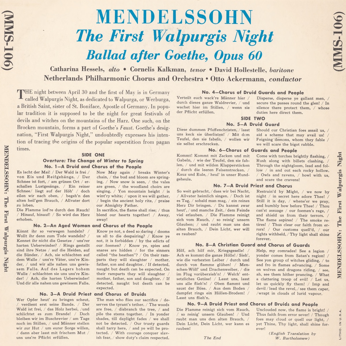 Felix Mendelssohn, La Première nuit de Walpurgis, Cantate profane d'après la ballade de Goethe, op. 60, MWV D 3, Catharina Hessels, alto, Cornelis Kalkman, ténor, David Hollestelle, basse-bariton, «Netherlands Philharmonic Chorus and Orchestra», Otto Ackermann, 24 juillet 1952, Hilversum