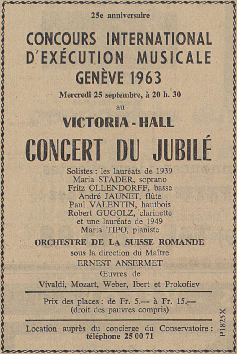Au programme de ce concert de jubilé donné le 25 septembre 1963 au Victoria Hall de Genève par l'Orchestre de la Suisse Romande placé sous la direction de son chef-fondateur Ernest ANSERMET, les solistes étant les lauréats du Ier Concours international d'exécution musicale de Genève (1939) - à l'exception de Maria Tippo lauréate en 1949: