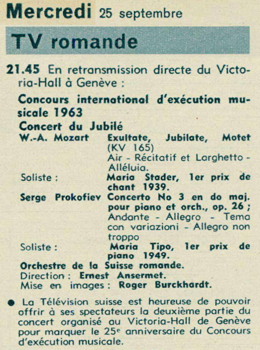 La seconde partie de ce concert fut retransmise en direct par la Télévision Suisse Romande: