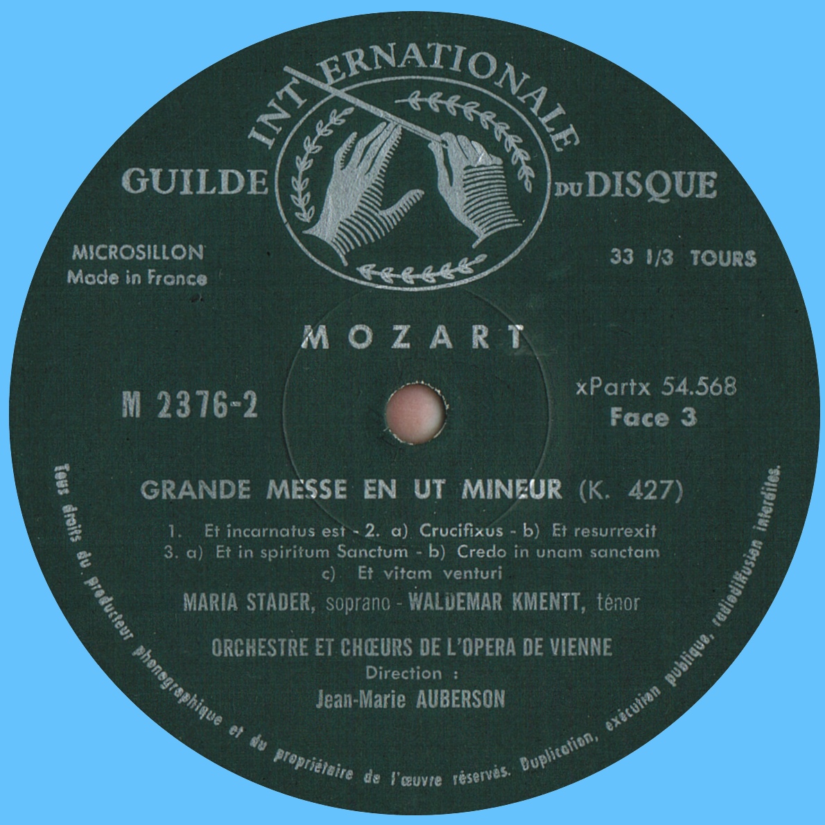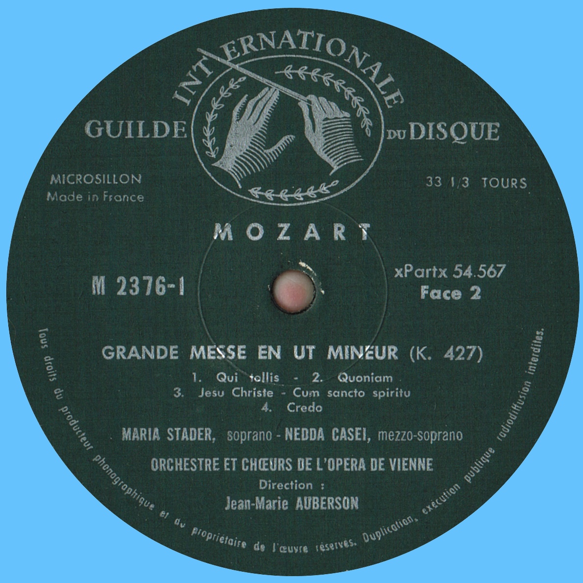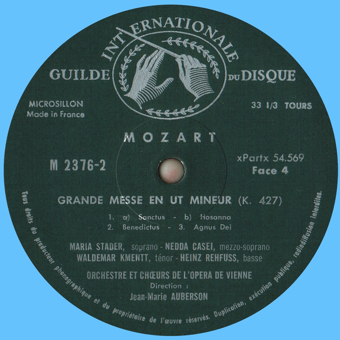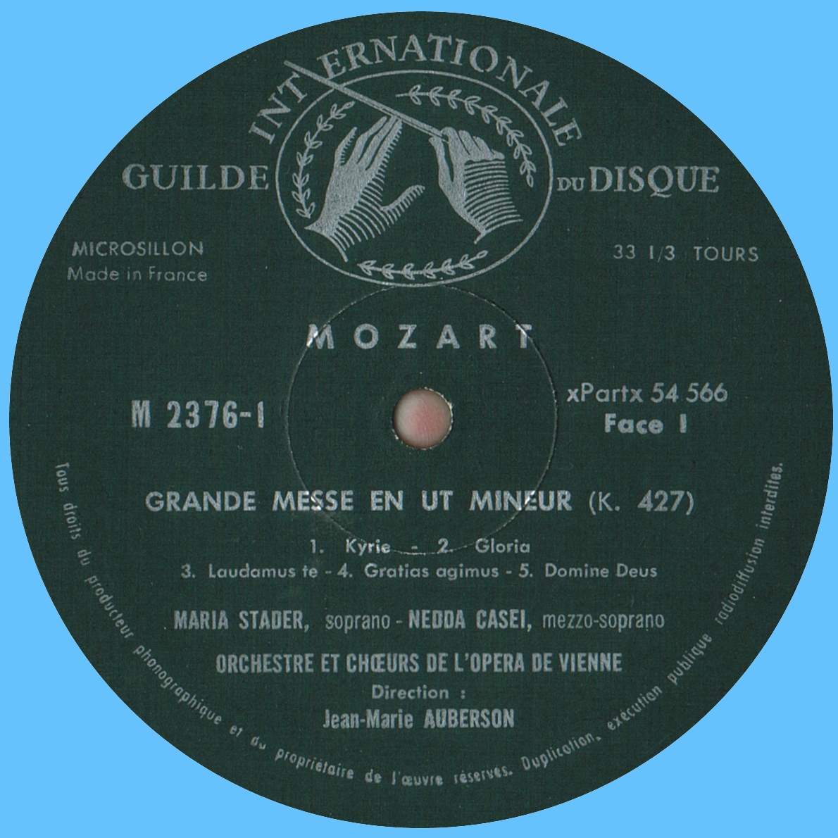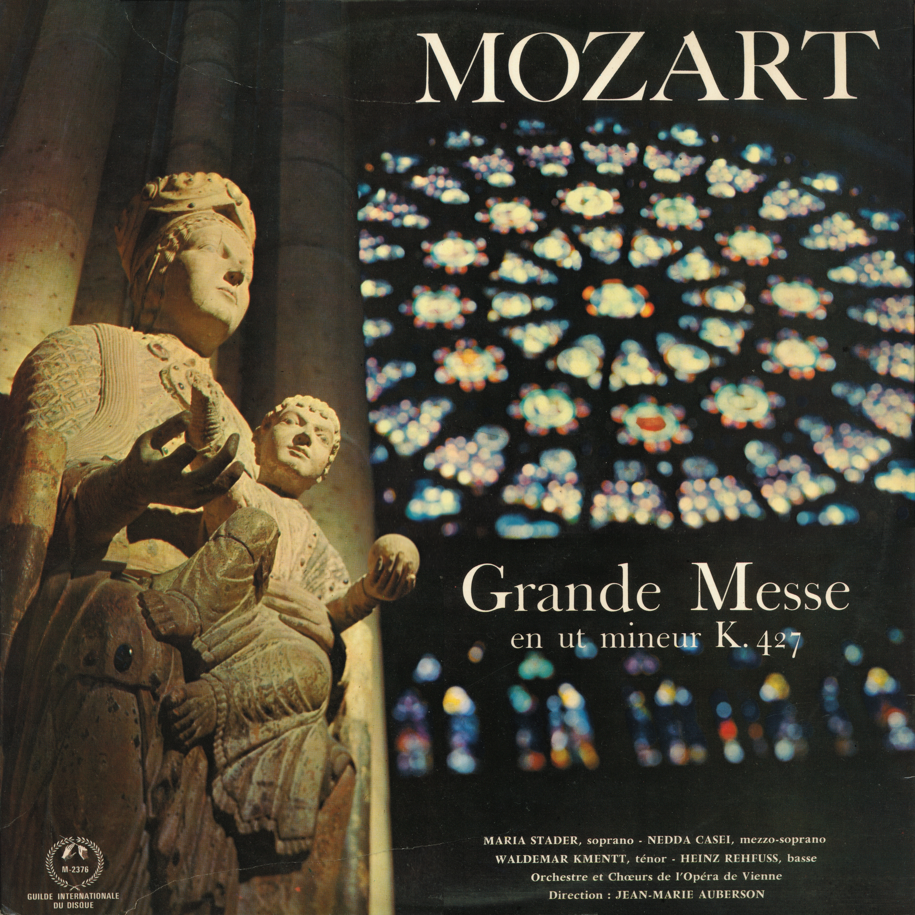 Wolfgang Amadeus Mozart, Grande messe en ut mineur, KV 427 (*), Maria STADER, soprano, Nedda CASEI, mezzo-soprano, Waldemar KMENTT, ténor, Heinz REHFUSS, basse, Choeur et Orchestre de l'Opéra d'État de Vienne, Jean-Marie AUBERSON, enregistré dans la Grande Salle du «Wiener Konzerthaus»