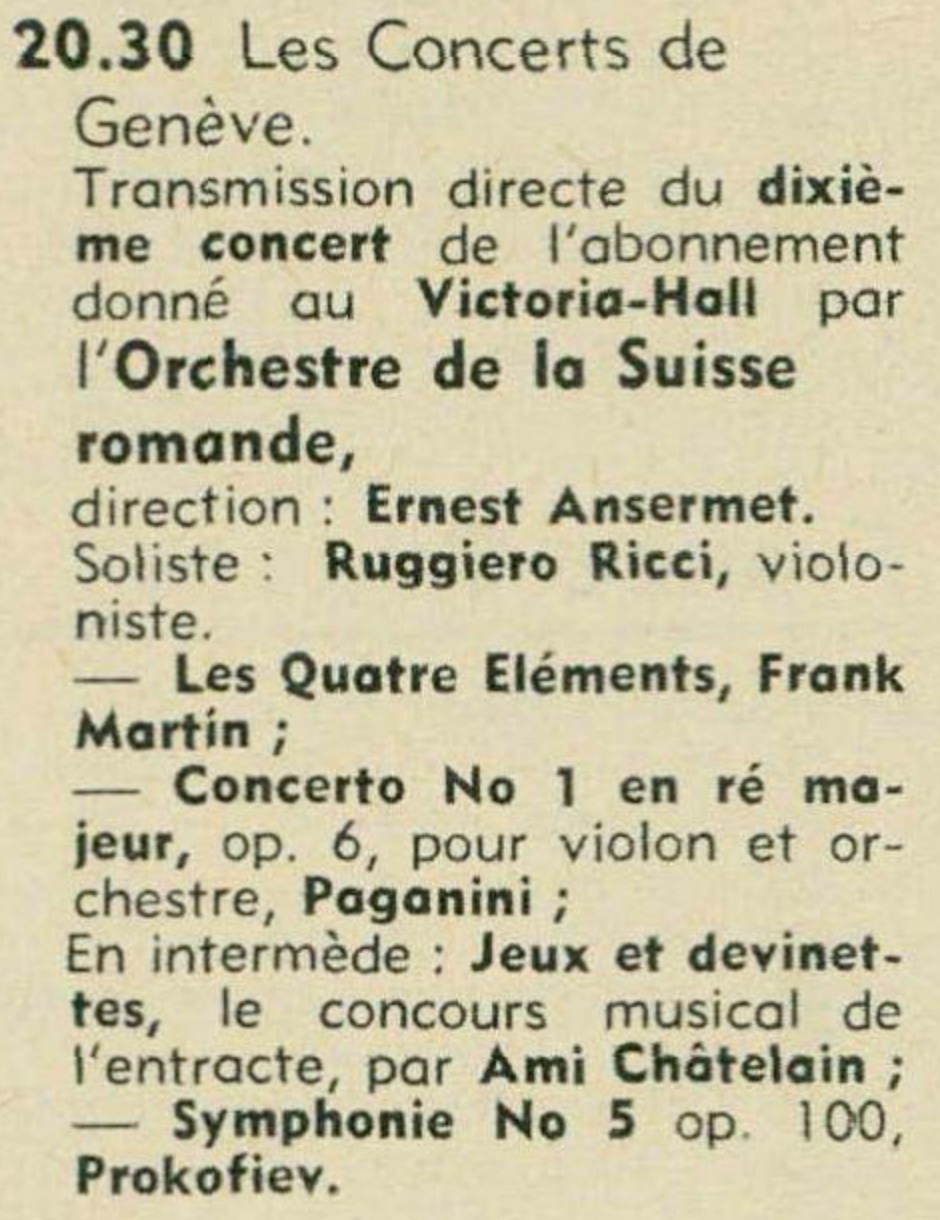 Niccolo Paganini, Concerto pour violon et orchestre No 1 op. 6 en mi bémol majeur, transposé en ré majeur, Ruggiero Ricci, Orchestre de la Suisse Romande, Ernest Ansermet, 2 mars 1966, Victoria Hall, Genève