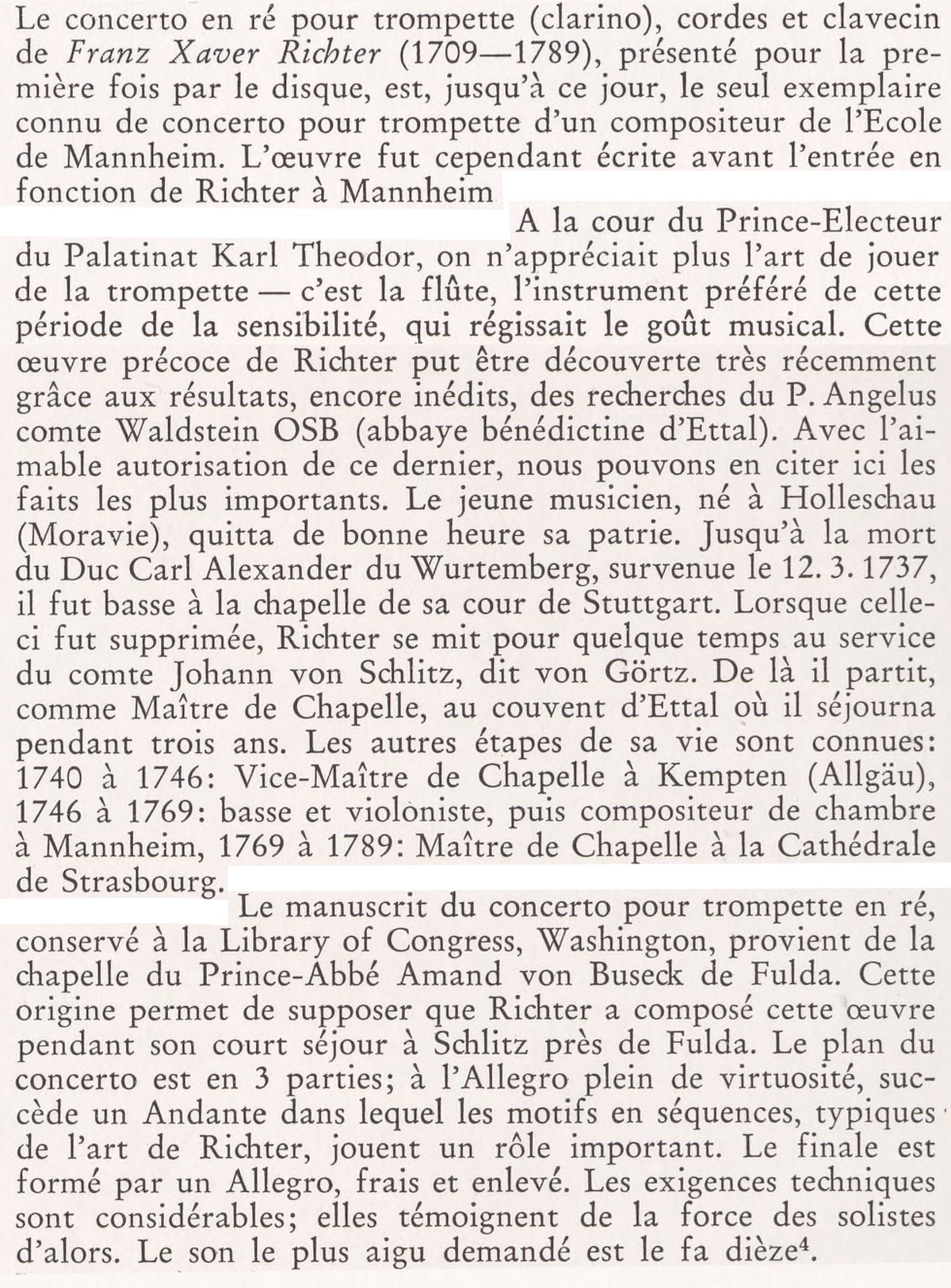 Franz Xaver Richter, Concerto pour trompette et orchestre en ré majeur, Maurice André, trompette, Hilde Noe, clavecin, Orchestre de Chambre de Munich, Hans Stadlmayr, 26-29 novembre 1966, Salle Hercules de la Résidence de Munich
