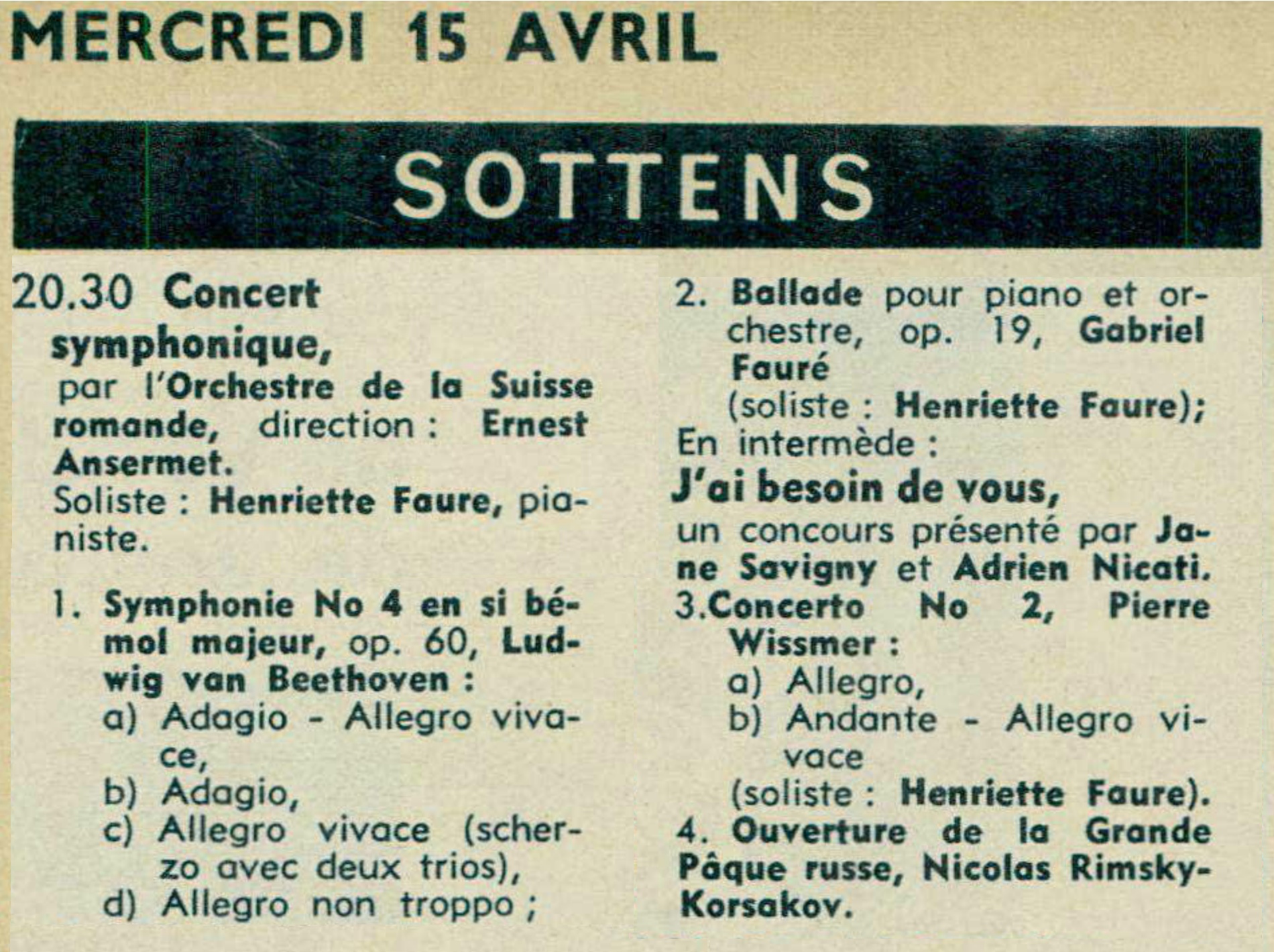 Au programme de ce concert du 15 avril 1959, donné dans le Grand studio de Radio-Genève (l'actuel Studio Ansermet) et retransmis en direct sur l'émetteur de Sottens dans le cadre du traditionnel concert du mercredi soir: