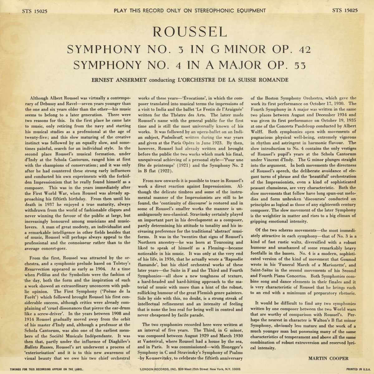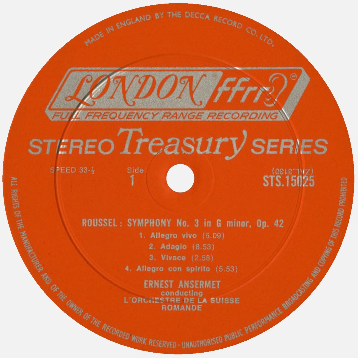 L'Orchestre de la Suisse Romande et Ernest ANSERMET enregistrèrent les symphonies No 3 et No 4 de Roussel pour Decca, dans des sessions allant du 1er au 11 mai 1956, bien entendu dans le Victoria Hall de Genève. À cette époque du début de la stéréophonie, les prises de son furent faites sous la direction de James Walker en mono ET en stéréo, simultanément par deux ingénieurs du son différents - Gil Went pour celui en mono et James Brown pour l'enregistrement en stéréo.
