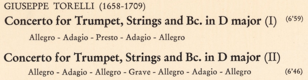 Pour le Concerto en ré majeur (I), il s'agit de la même oeuvre que celle proposée sur cette page de mon site - également un enregistrement avec Maurice André -, et nommée „Concerto pour trompette et cordes en ré majeur 'Estienne Roger 188', P.A.2.2.18“.