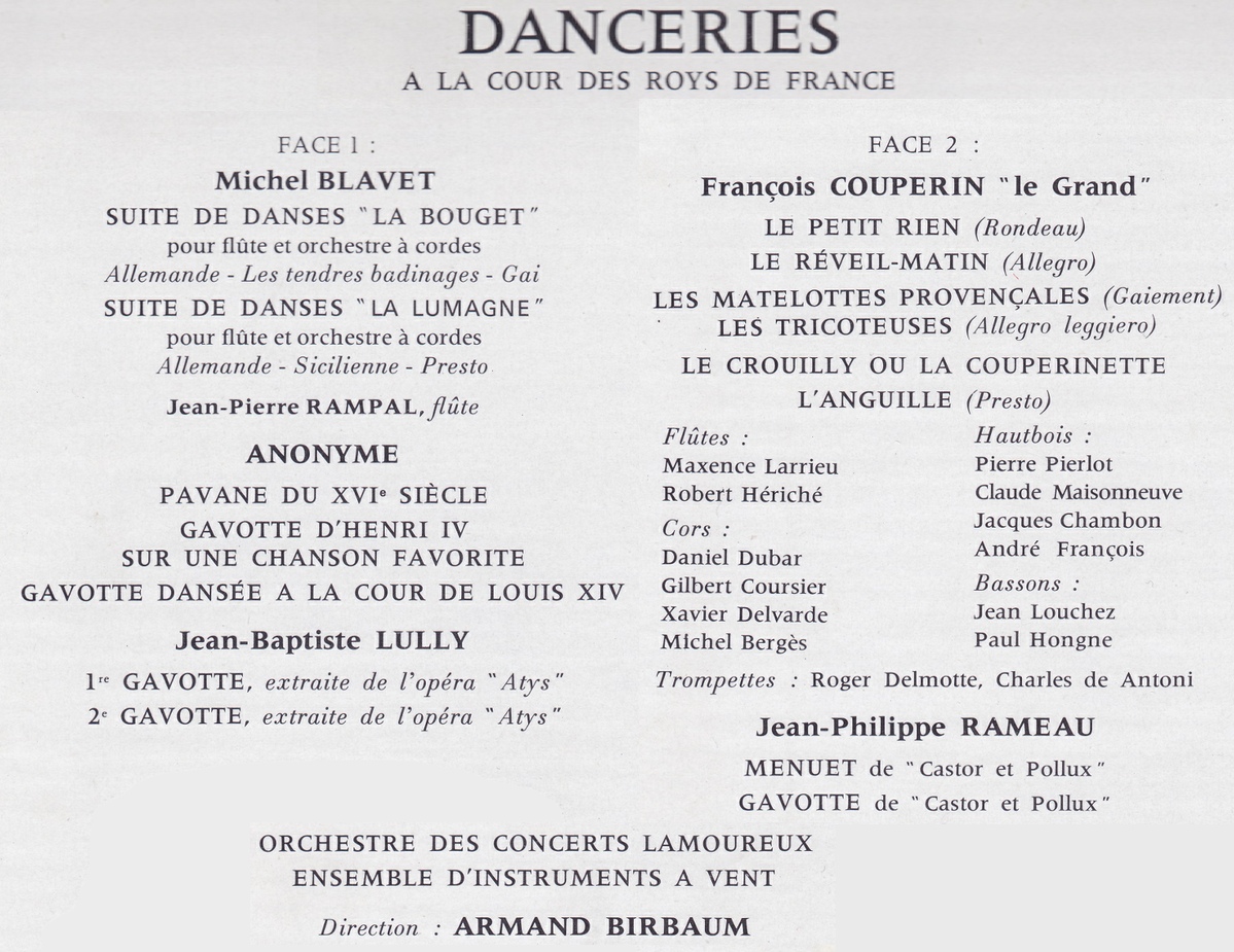 Michel Blavet, Suite de danses „La Bouget“ et „La Lumagne“ pour flûte et orchestre à cordes, Jean-Pierre Rampal, Cordes de l'Orchestre des Concerts Lamoureux, Armand Birbaum, 21-23 décembre 1965, Paris