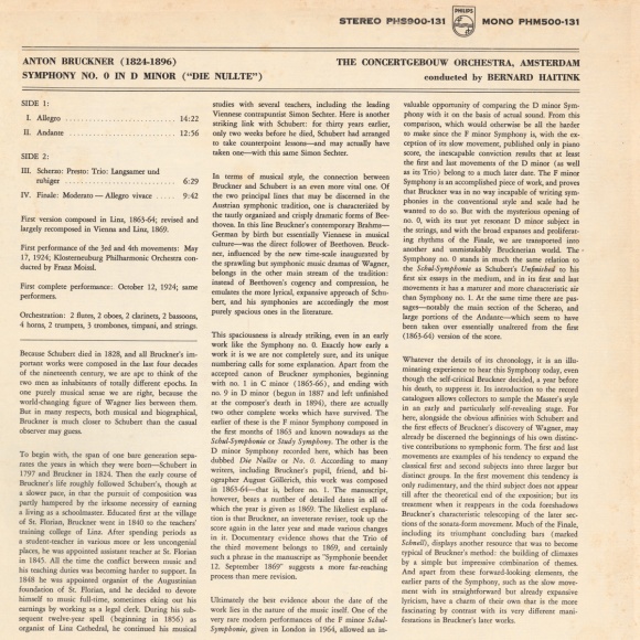 Anton Bruckner, Symphonie en ré mineur, «Die Nullte», „No 0“, Orchestre du Concertgebouw, Bernhard Haitink, 4 au 6 juin 1966, Grande Salle du Concertgebouw d'Amsterdam