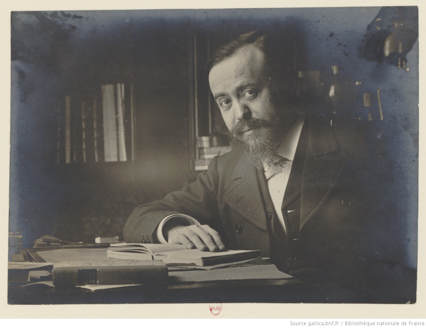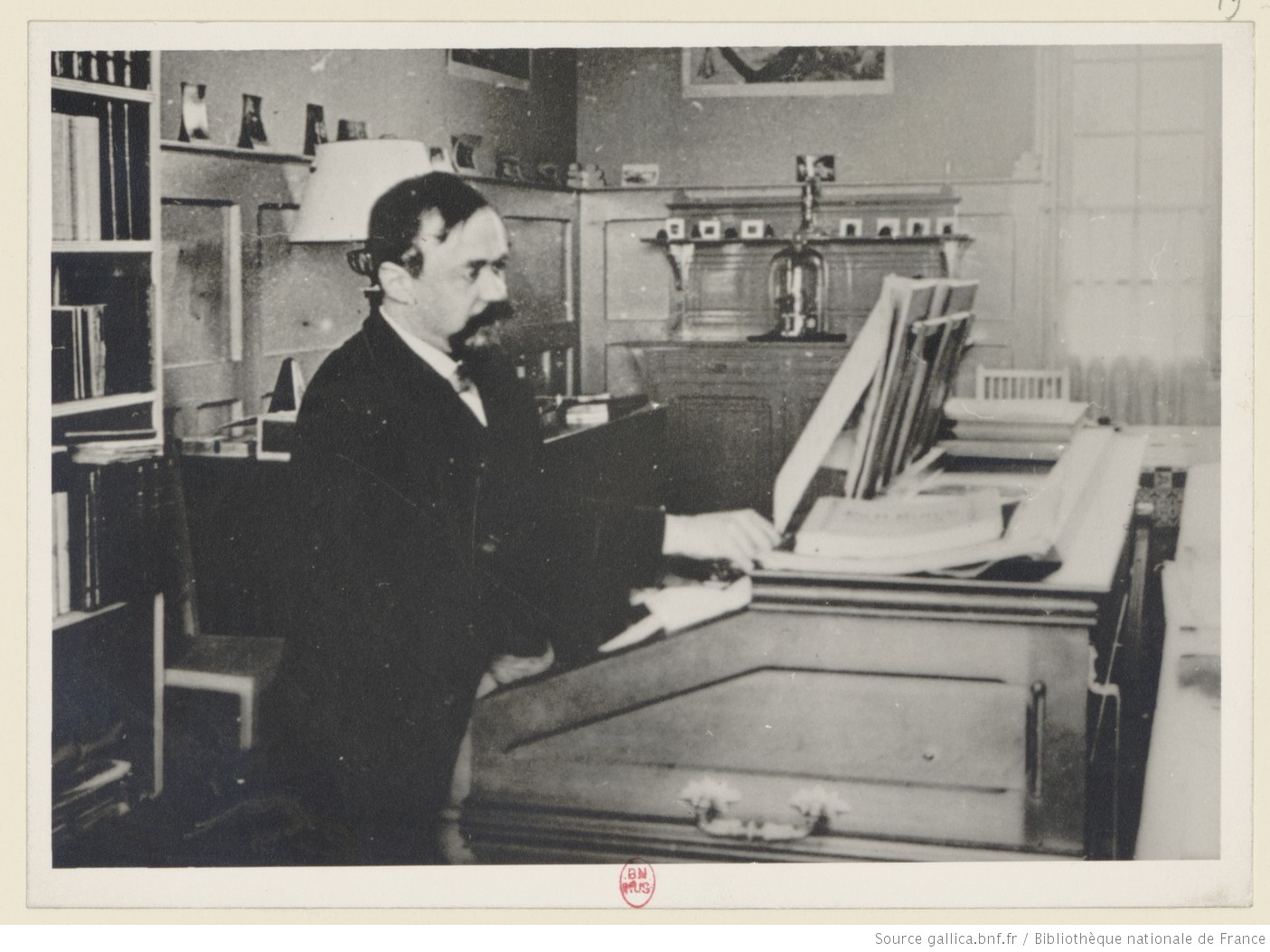 Paul Dukas à son bureau, à Paris. Date d'édition: 1900. Droits: domaine public. Identifiant: ark:/12148/btv1b8417362n. Source: Bibliothèque nationale de France. Notice du catalogue, Notice de recueil, Photo