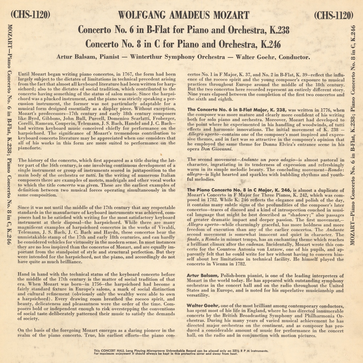 Le Concerto pour piano No 8 en ut majeur, KV 246, de Mozart fut écrit à Salzburg en 1776 pour l'une des élèves du compositeur, âgée de vingt ans, la comtesse Lützow, épouse du commandant de la forteresse de «Hohensalzburg», qui dominait la ville, mais surtout, la nièce du Prince-Archevéque Colloredo (souverain de Salzburg et employeur de Mozart). Il s'agit en fait de la première oeuvre originale de Mozart sous cette forme. Les quatre premiers concerti étaient des arrangements de mouvements de sonates de Raupach, Honauer, Schobert, Eckard et C.P.E. Bach, réalisés par le jeune garçon de onze ans en 1767, afin de disposer d'un grand nombre de pièces efficaces pour son voyage à Vienne, en compagnie de son père, cette année-là. Bien que le KV 246 reflète l'élégance et le raffinement de l'époque, il contient de nombreux signes subtils des profondeurs des concertos ultérieurs du compositeur - des traces de discorde et une sorte d'introspection formulée dans un langage musical que l'on pourrait qualifier au mieux d'„ombrageux“, ainsi que des passages d'un plus grand impact dramatique et d'une passion plus profonde.
