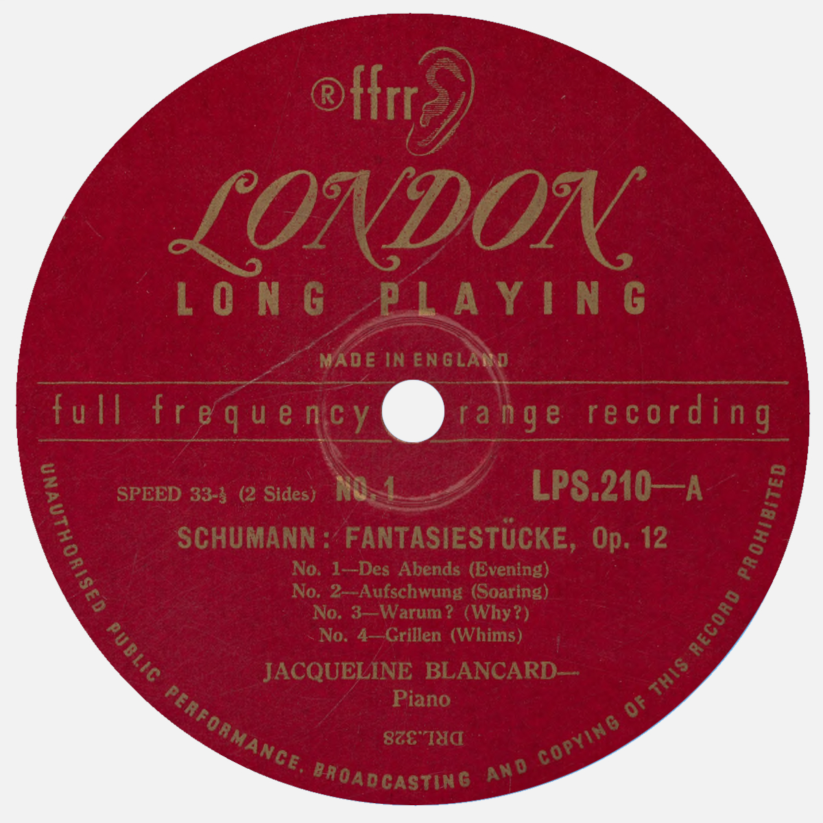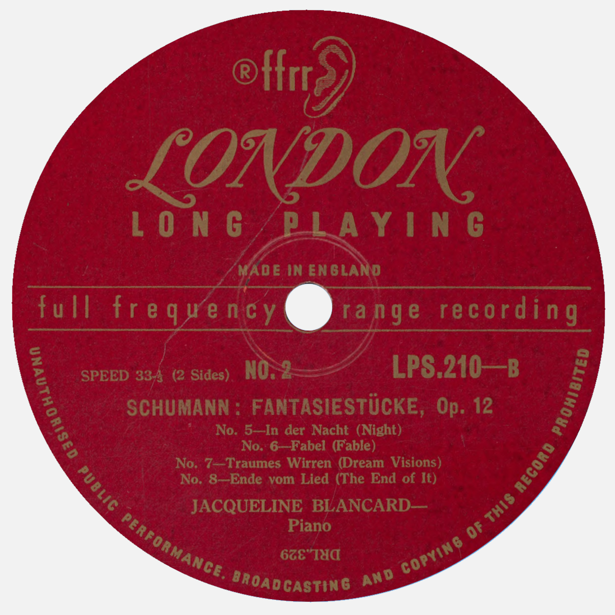 Les huits «Fantasiestücke», „Pièces de fantaisie“, Op. 12, de Robert SCHUMANN sont ici interprétées par Jacqueline BLANCARD. Elle les enregistra pour le label Decca les 6 et 13 avril 1950, dans leur studio londonien de «West Hampstead»: