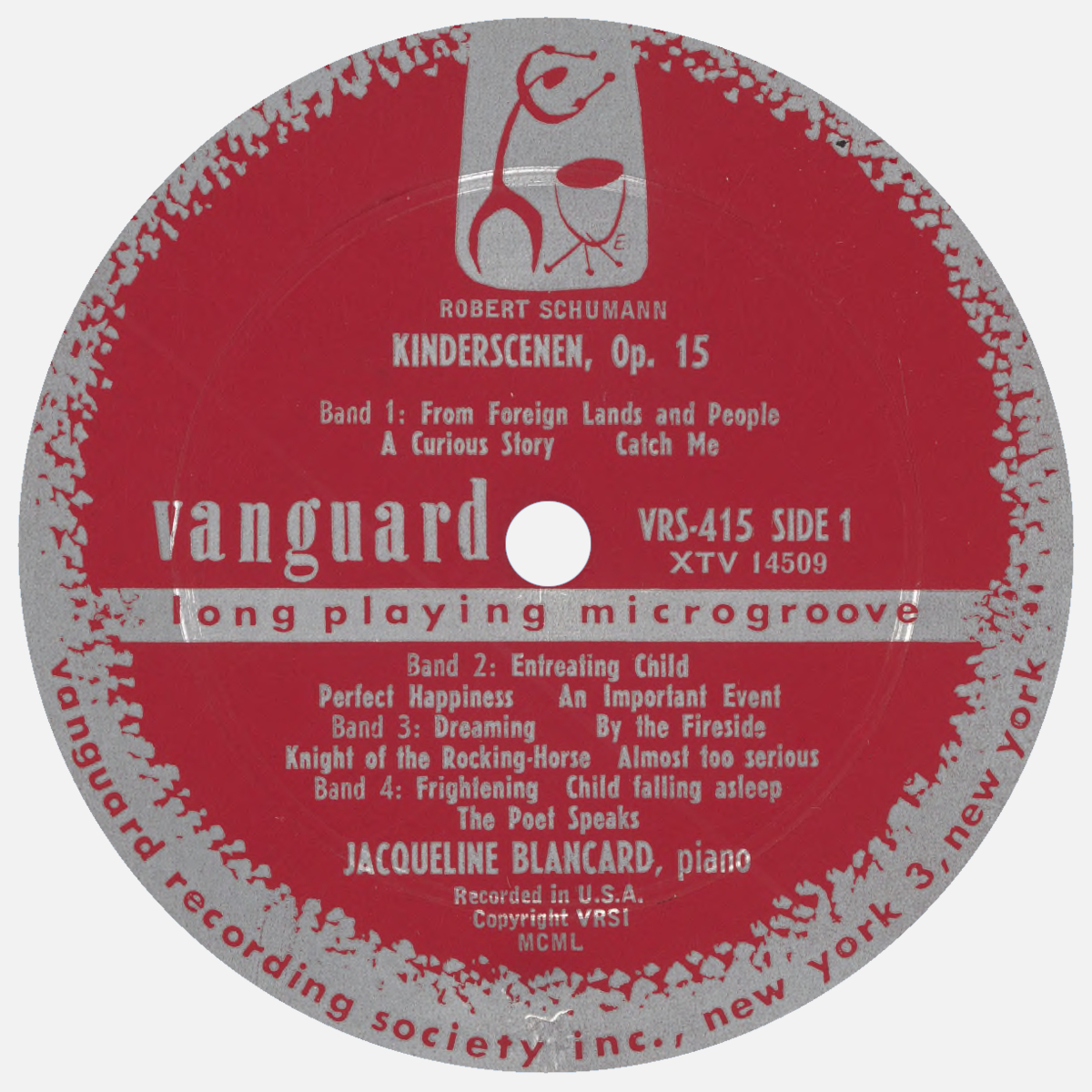 Les „Scènes d'enfants“, Op. 15, de Robert SCHUMANN sont ici interprétées par Jacqueline BLANCARD. Elle les enregistra pour le label Vanguard en 1950, elles furent publiées sur le recto de ce disque Vanguard VRS 415: