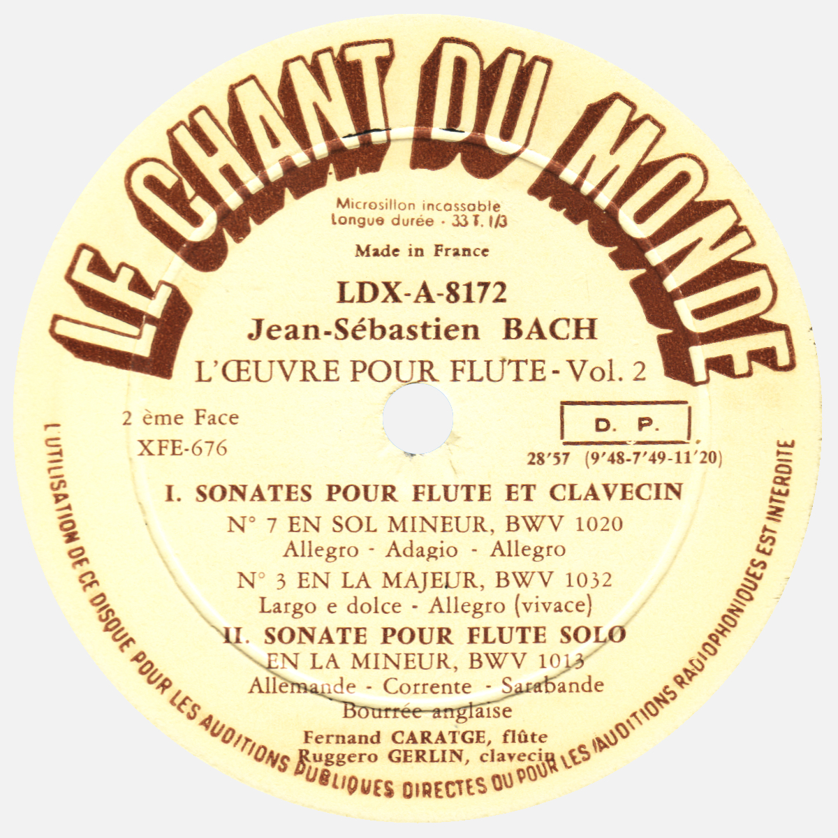 Dans l'interprétation proposée ici, Fernand CARATGÉ est à la flûte et Ruggero GERLIN au clavecin, un enregistrement datant de 1955 (selon la discographie de Michael GRAY). Première publication: sur le recto du disque Le Chant du Monde LDX-A-8172 de l'album Le Chant du Monde LDX-A-8171-72 (*) - consacré à l'Oeuvre pour flûte de Bach - publié au plus tard en 1957 (mentionné dans plusieurs revues parue en 1957, par exemple dans "Le Guide du concert et du disque" ainsi que dans "Europe: revue littéraire mensuelle" et "Journal Des Instituteurs Et Des Institutrices").