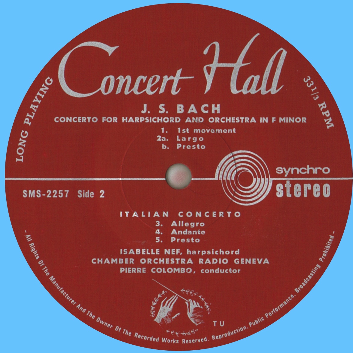 Selon la discographie de Michael GRAY les enregistrements des BWV 1055, 1056 et 971 datent de 1961; il n'est toutefois pas indiqué si la Fantaisie BWV 906 a été enregistrée dans la même période. Le tout est paru en mono sur MMS 2257 et en „Synchro Stéréo“ sur SMS 2257. Dans le début des années 1960, „Synchro Stéréo“ était la dénomination souvent utilisée par „Concert Hall / Musical Masterpiece Society“ pour une mono transformée électroniquement en stéréo: pour ce disque, l'enregistrement d'origine a peut-être été vraiment fait en stéréo, difficile à déterminer. Mais qu'importe, l'interprétation reste superbe: en soliste Isabelle NEF, accompagnée par l'Orchestre de Chambre de Radio-Genève, le tout sous la direction de Pierre COLOMBO.