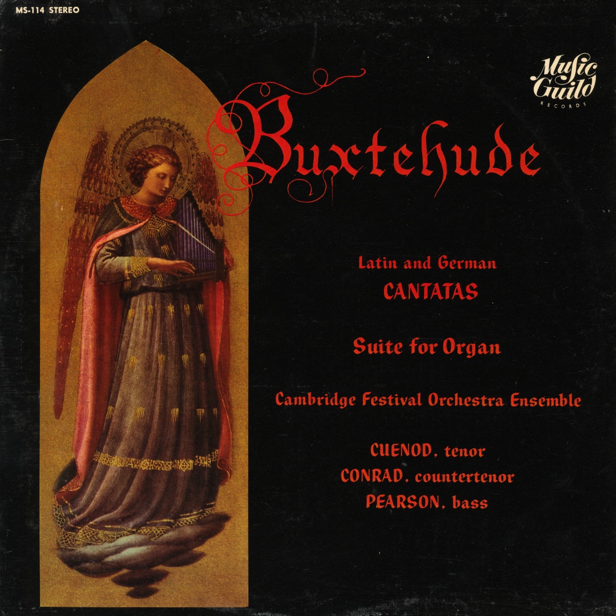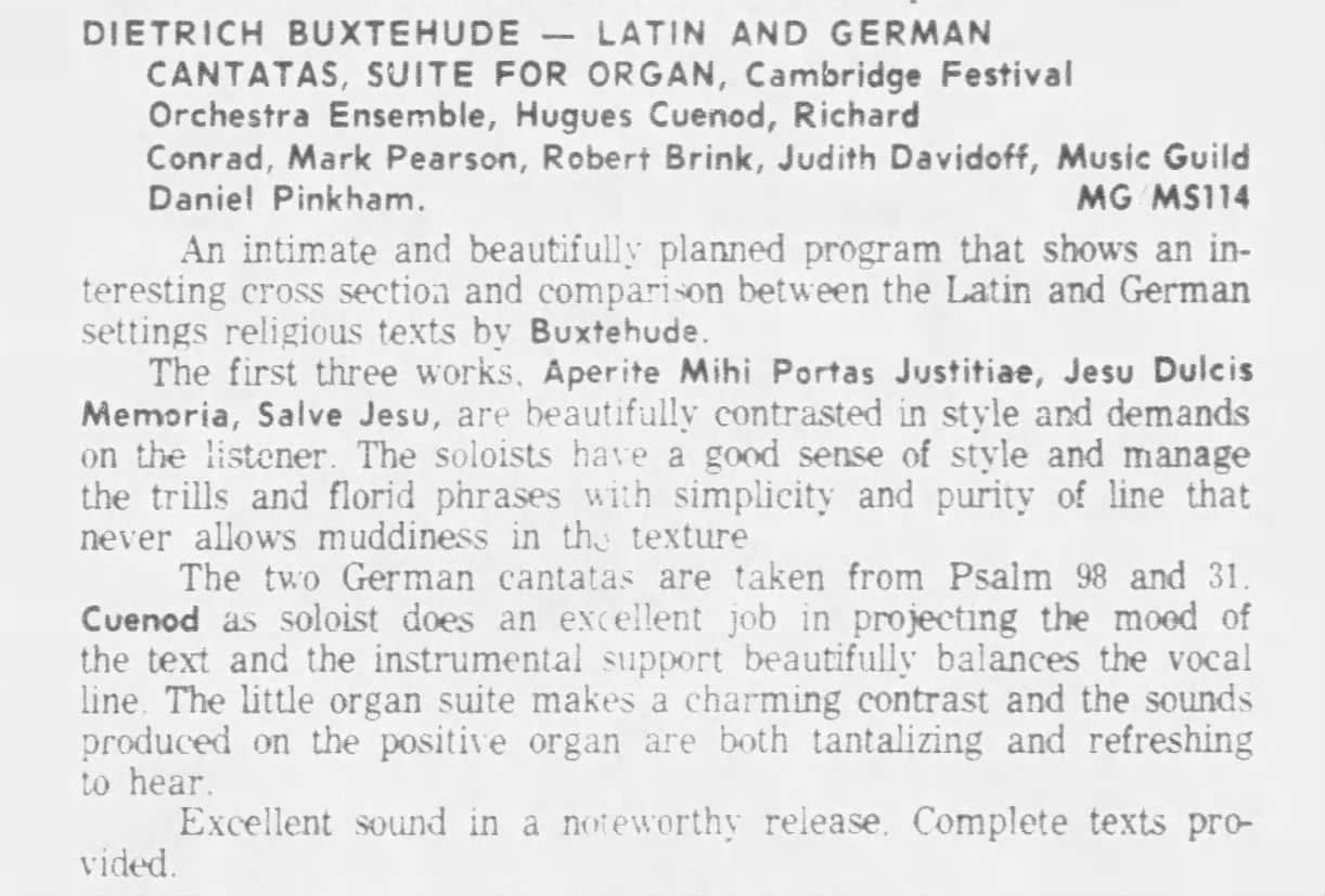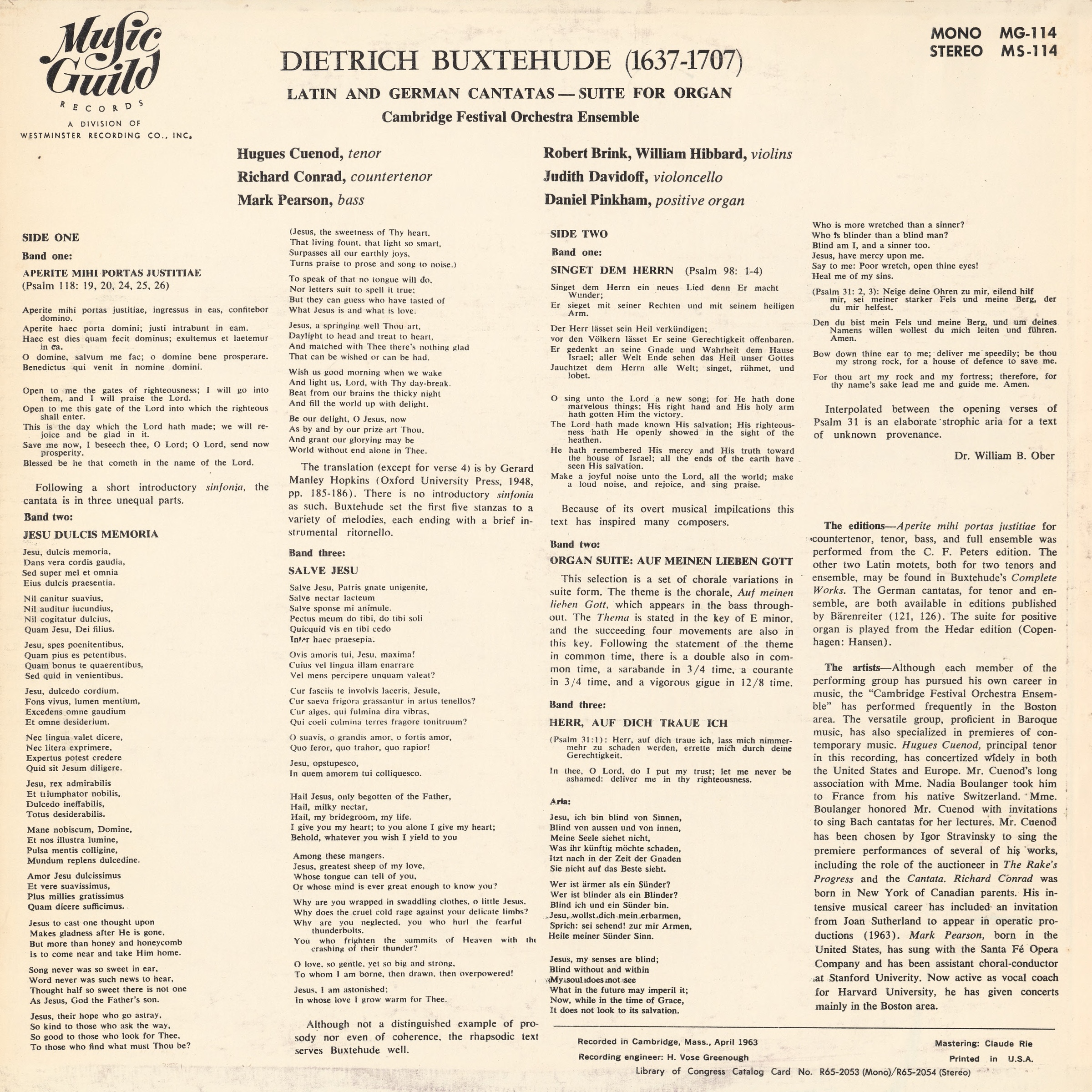 Ce disque est entièrement consacré à des oeuvres de Dietrich Buxtehude: «Aperite mihi portas justitiae», BuxWV 7, «Jesu, dulcis memoria», BuxWV 57-56, «Salve Jesu», BuxWV 94, «Singet dem Herrn», BuxWV 98, suite pour orgue «Auf meinen lieben Gott», BuxWV 179, «Herr, auf dich traue ich», BuxWV 35. Au bas droit du verso de la pochette du disque MS-114 est indiqué «Recorded in Cambridge, Mass., April 1963 - Recording engineer: H. Vose Greenough». En fait elles ne furent pas enregistrées à Cambridge, mais un mois plus tôt, du 1er au 15 mars 1963, dans la «Kings Chapel» de Boston, Massachusetts, selon cette fiche du catalogue de la «Library of Congress», «H.V. Greenough Collection».