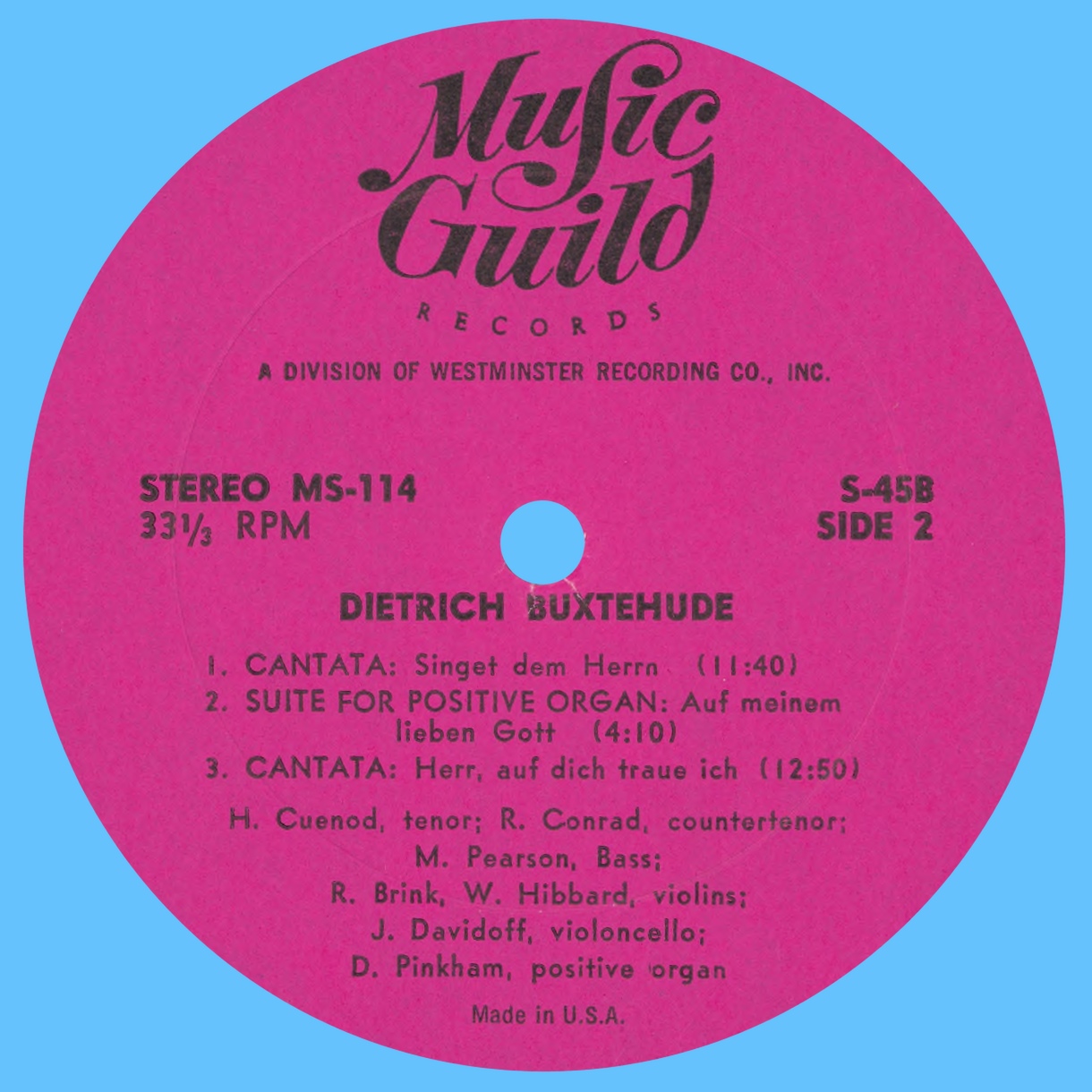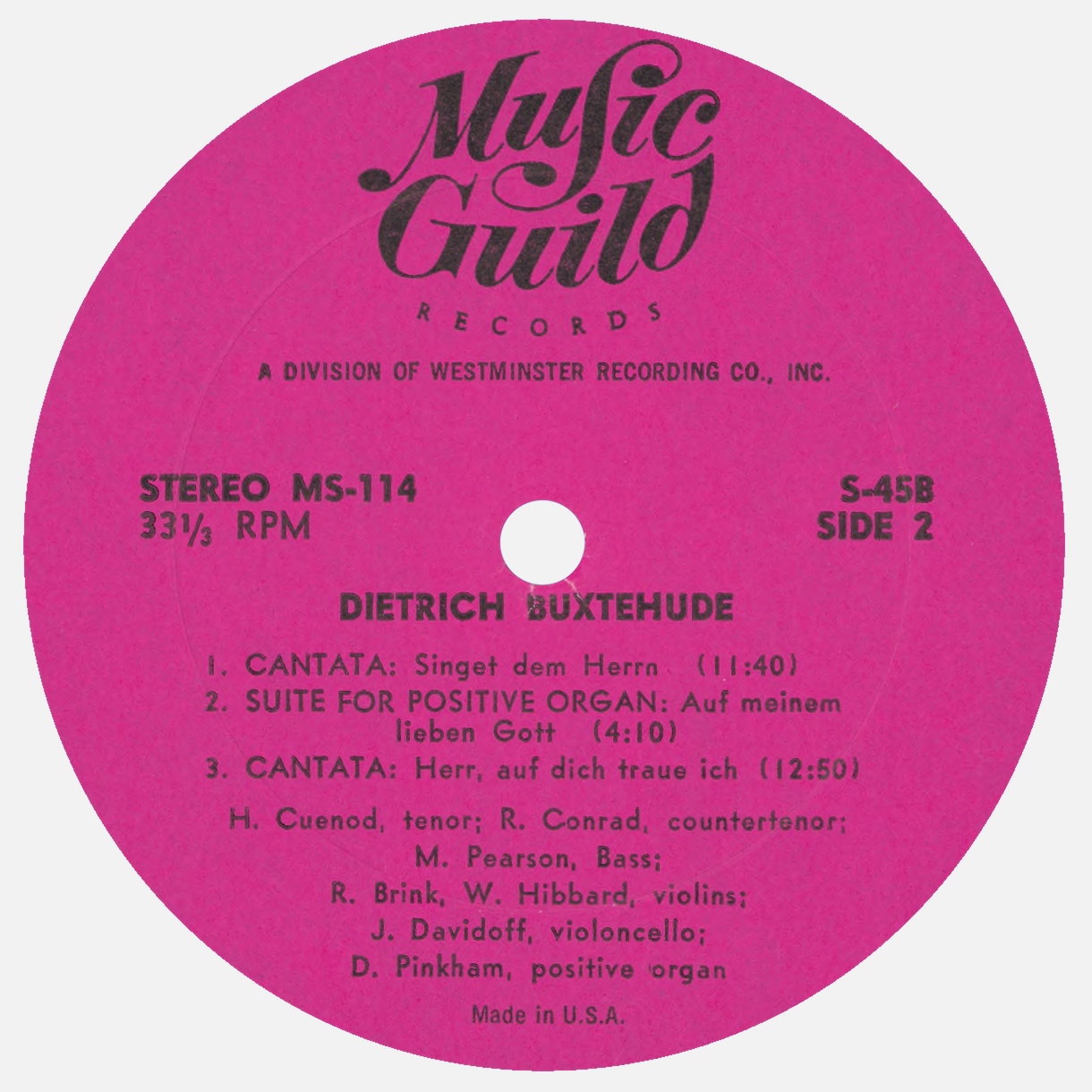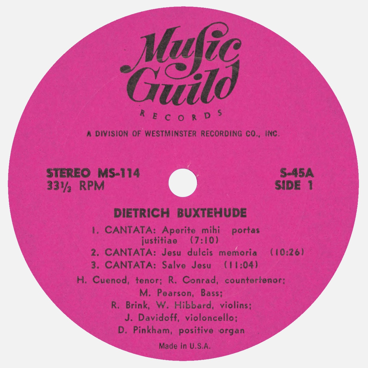 Ce disque est entièrement consacré à des oeuvres de Dietrich Buxtehude: «Aperite mihi portas justitiae», BuxWV 7, «Jesu, dulcis memoria», BuxWV 57-56, «Salve Jesu», BuxWV 94, «Singet dem Herrn», BuxWV 98, suite pour orgue «Auf meinen lieben Gott», BuxWV 179, «Herr, auf dich traue ich», BuxWV 35. Au bas droit du verso de la pochette du disque MS-114 est indiqué «Recorded in Cambridge, Mass., April 1963 - Recording engineer: H. Vose Greenough». En fait elles ne furent pas enregistrées à Cambridge, mais un mois plus tôt, du 1er au 15 mars 1963, dans la «Kings Chapel» de Boston, Massachusetts, selon cette fiche du catalogue de la «Library of Congress», «H.V. Greenough Collection».