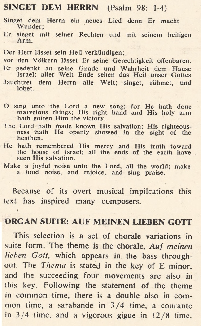 Ce disque est entièrement consacré à des oeuvres de Dietrich Buxtehude: «Aperite mihi portas justitiae», BuxWV 7, «Jesu, dulcis memoria», BuxWV 57-56, «Salve Jesu», BuxWV 94, «Singet dem Herrn», BuxWV 98, suite pour orgue «Auf meinen lieben Gott», BuxWV 179, «Herr, auf dich traue ich», BuxWV 35. Au bas droit du verso de la pochette du disque MS-114 est indiqué «Recorded in Cambridge, Mass., April 1963 - Recording engineer: H. Vose Greenough». En fait elles ne furent pas enregistrées à Cambridge, mais un mois plus tôt, du 1er au 15 mars 1963, dans la «Kings Chapel» de Boston, Massachusetts, selon cette fiche du catalogue de la «Library of Congress», «H.V. Greenough Collection».