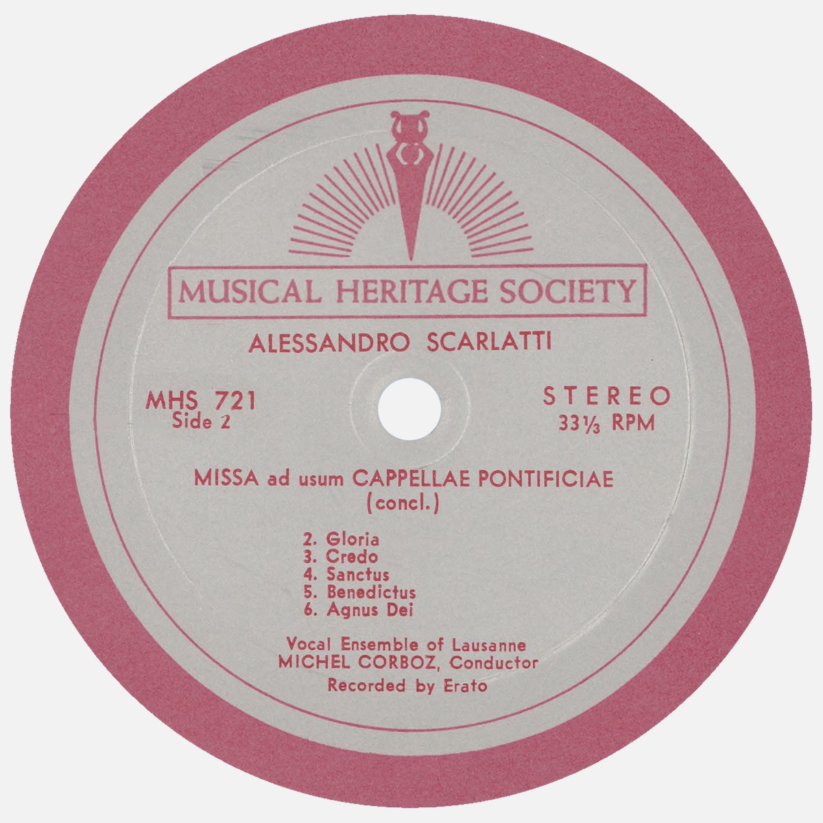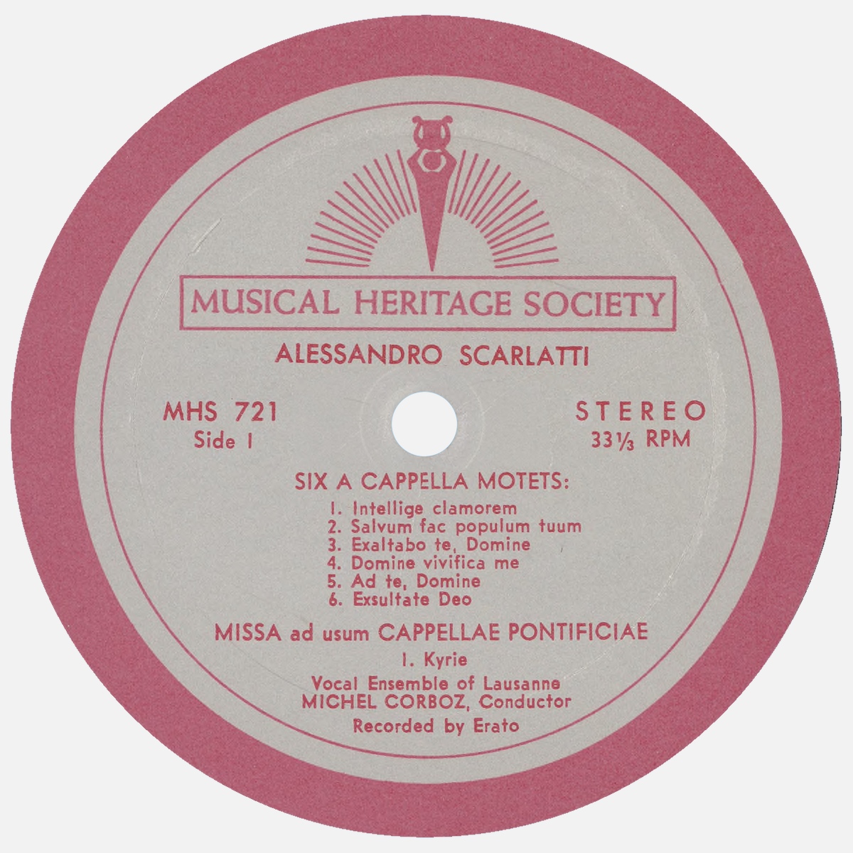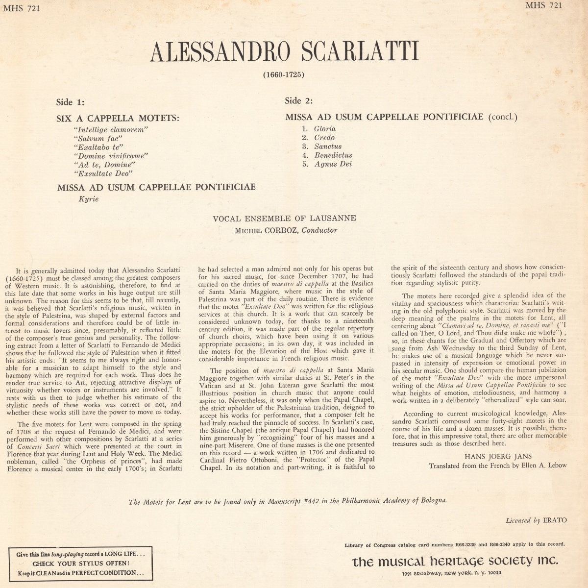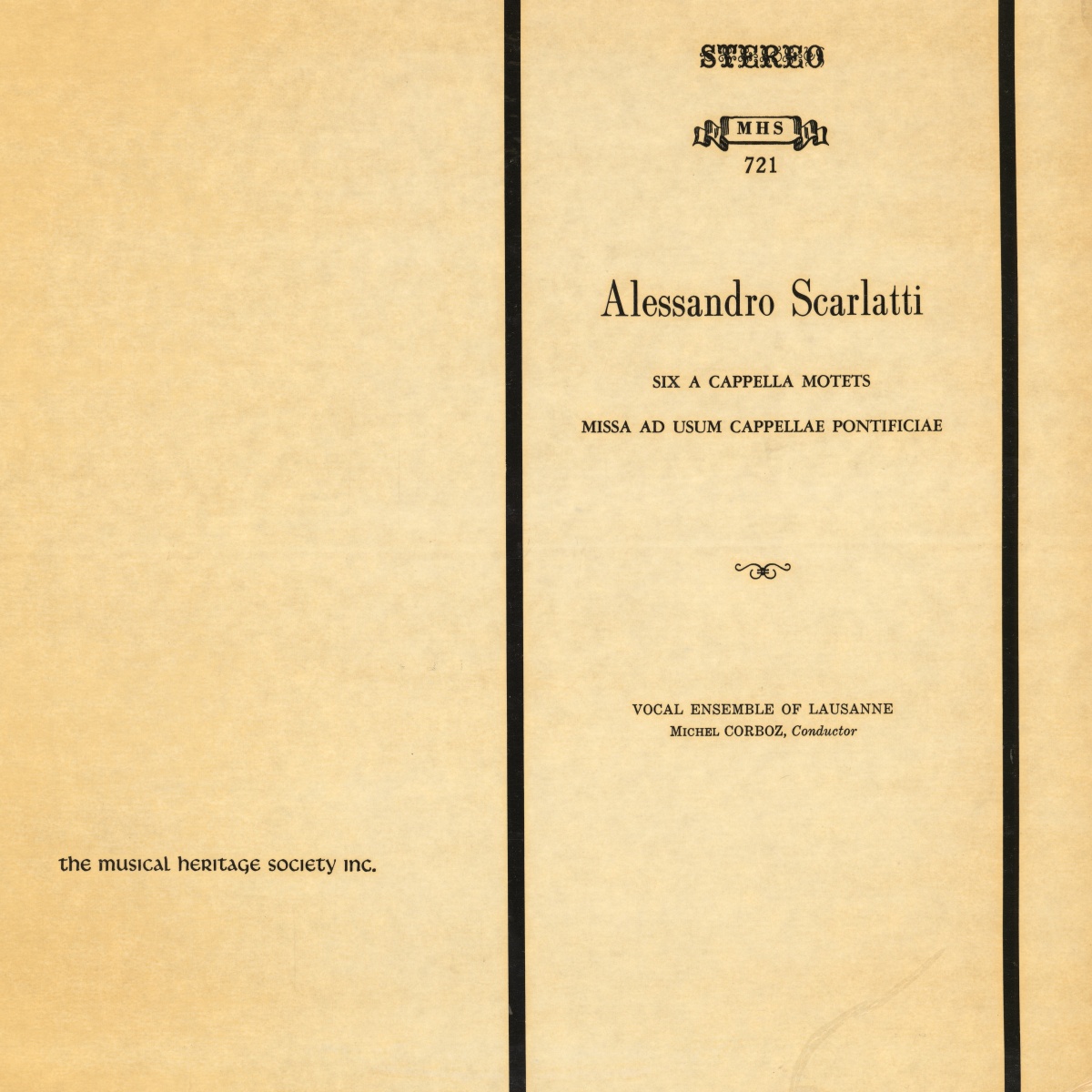 Alessandro Scarlatti, „Missa ad usum Cappellae Pontificale“, Ensemble Vocal de Lausanne, Michel Corboz, 28 au 30 juin 1965, Église Notre Dame du Valentin, Lausanne