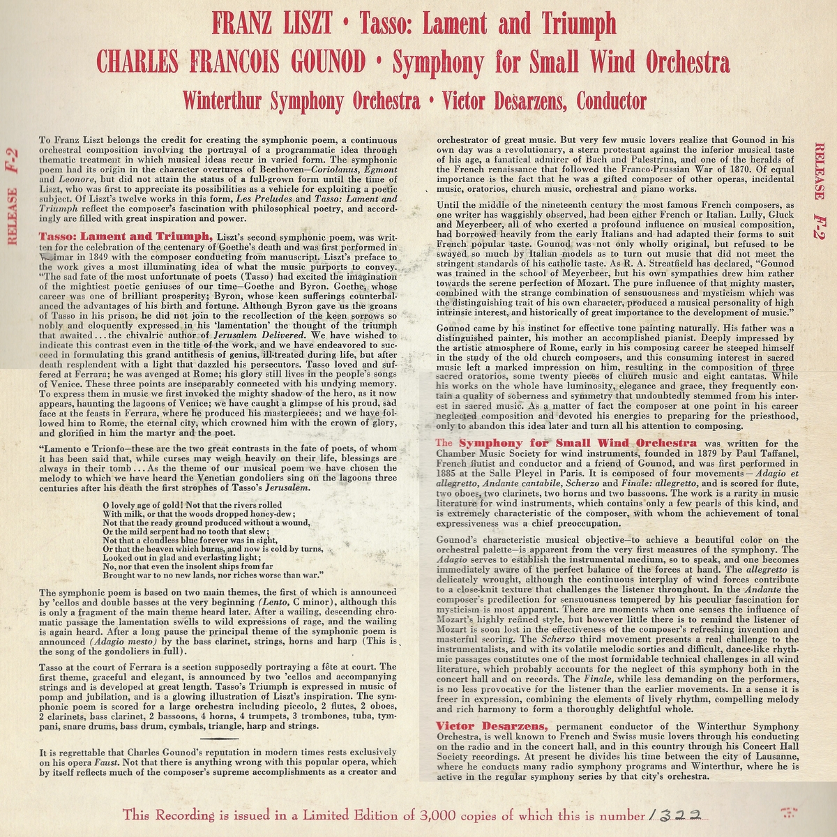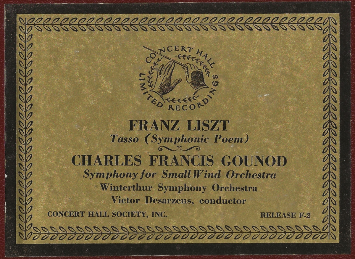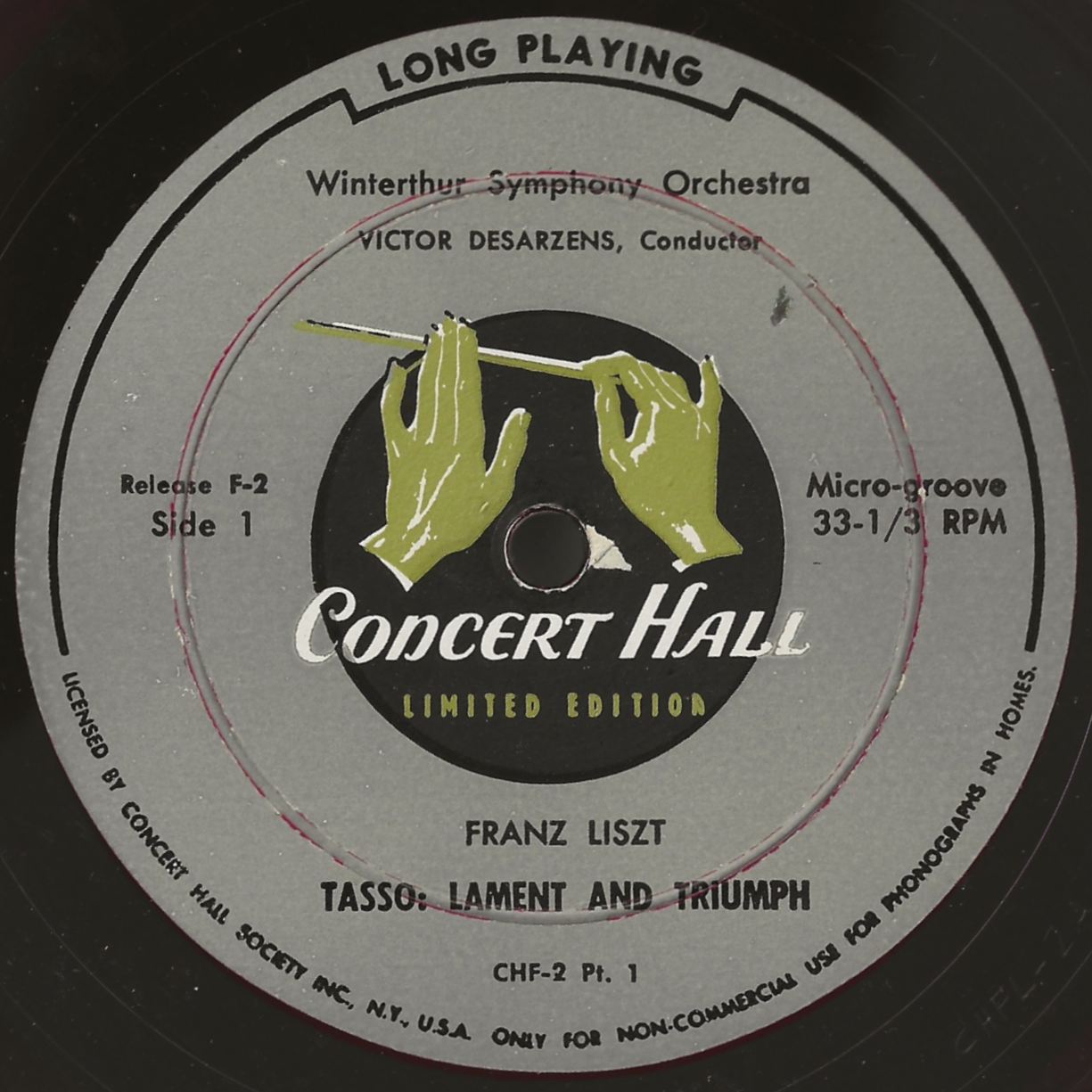 Franz Liszt, Tasso, Lamento e Trionfo (Tasso, Lamentation et Triomphe), 2e poème symphonique, S 96, Orchestre Symphonique de Winterthur, Victor Desarzens, 1951, Concert Hall Society, release F-2