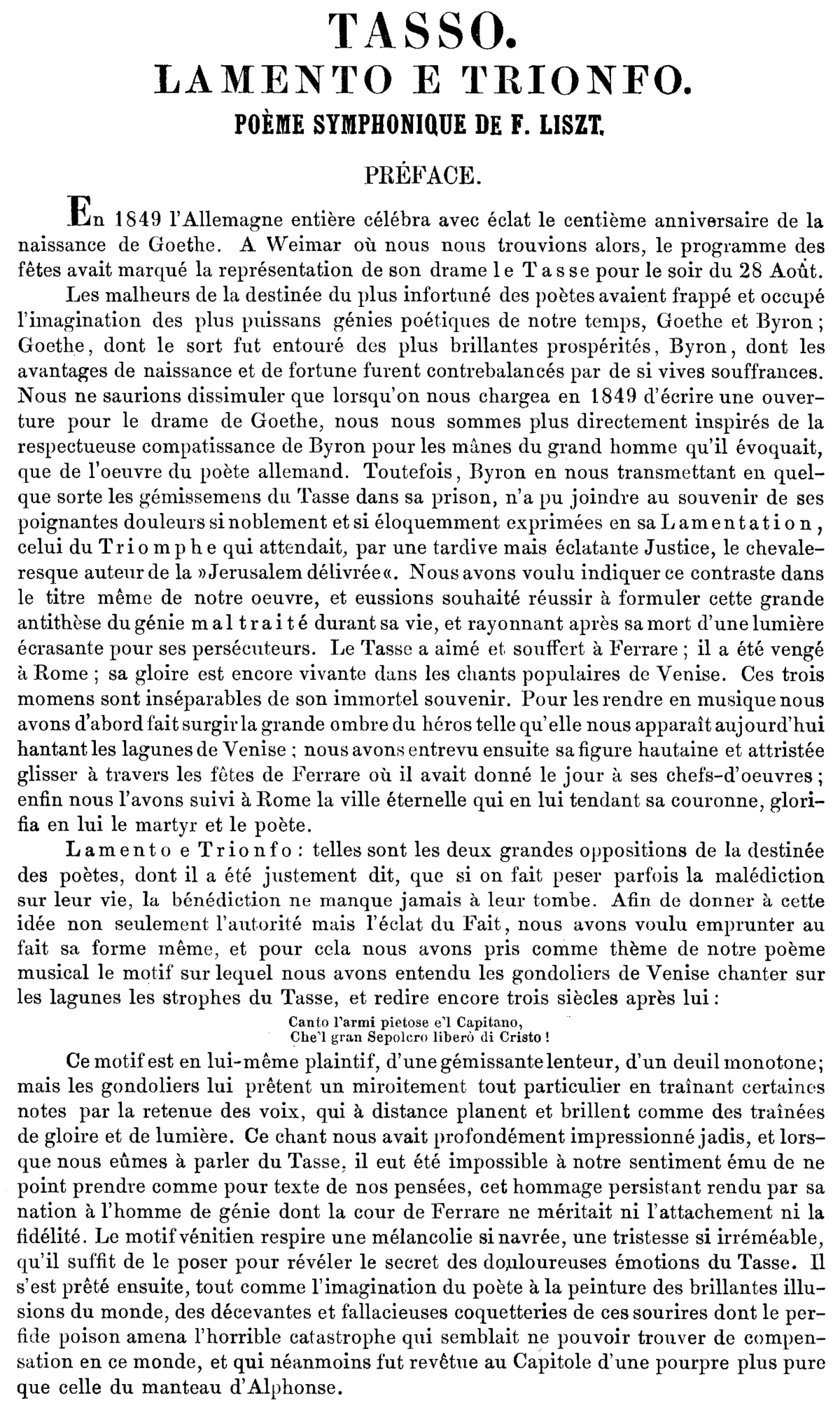 "Lamento et Trionfo - tels sont les deux grands contrastes du destin des poètes, dont on dit que, si les malédictions pèsent lourdement sur leur vie, les bénédictions sont toujours dans leur tombeau... Comme thème de notre poème musical, nous avons choisi la mélodie sur laquelle nous avons entendu les gondoliers vénitiens chanter sur les lagunes, trois siècles après sa mort, les premières strophes de la Jérusalem de Tasso.“