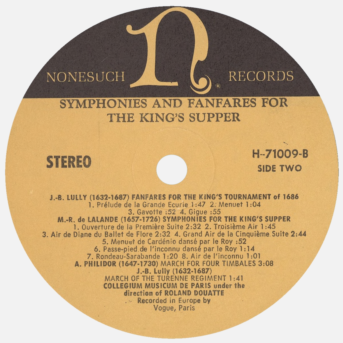 Ses Symphonies pour les Soupers du Roy ne constituent pas une oeuvre originale. Elles sont fournies de l'assemblage d'un certain nombre d'extraits de ses oeuvres, et même de l'ouverture du „Te Deum“! Leur enregistrement intégral eût nécessité plusieurs disques. Nous avons, quant à nous, fait choix d'un certain nombre de pièces parmi celles recueillies.