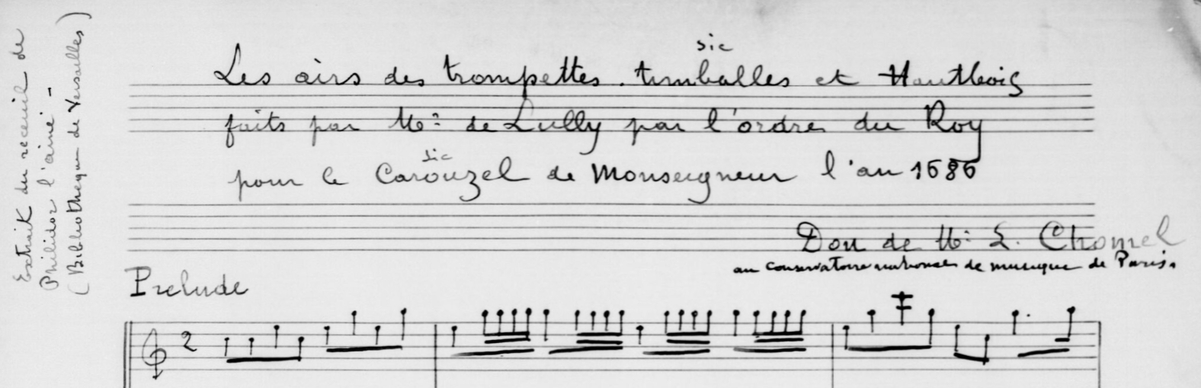 La Musique du Roi, qui fut organisée régulièrement par François 1er, comportait trois départements, la Musique de la Chapelle, la Musique de la Chambre, la Musique de la Grande Écurie. C'est l'une de ces oeuvres de circonstance que nous avons enregistrée ici, écrite pour le Carrousel de 1686. [...]" cité des notes publiées au verso de la pochette du disque Contrepoint MC 20.086
