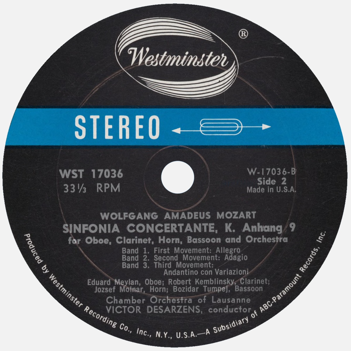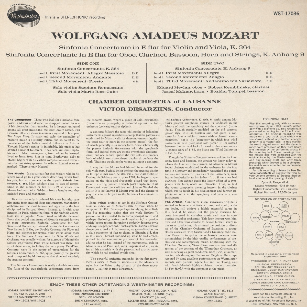 Victor DESARZENS et l'Orchestre de Chambre de Lausanne (OCL) enregistrèrent les oeuvres publiées sur ce disque Westminster WST 17036 en septembre 1961 à Lausanne, avec au verso cette Symphonie concertante pour hautbois, clarinette, cor et basson en mi bémol, KV 297b (Anh. C.14.01, Anh. 9), les solistes étant Eduard MEYLAN, hautbois, Robert KEMBLINSKY, clarinette-solo de l'OCL pendant une quarantaine d'années, depuis 1949 jusqu'à sa retraite!, Jozsef MOLNAR, cor et Bozidar TUMPEJ, basson: