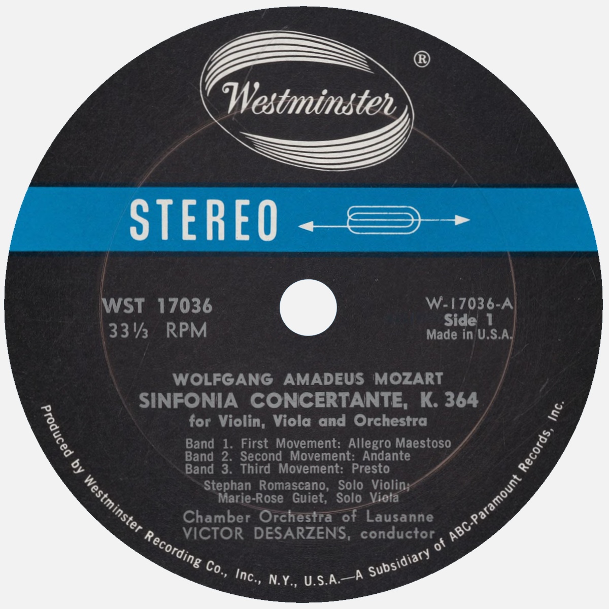 Victor DESARZENS et l'Orchestre de Chambre de Lausanne (OCL) enregistrèrent les oeuvres publiées sur ce disque Westminster WST 17036 en septembre 1961 à Lausanne, avec au recto cette Symphonie concertante pour violon, alto et orchestre en mi bémol majeur, KV 364 (KV 320d), les solistes étant Stéphane ROMASCANO, violon, et Marie-Rose GUIET, alto (*).
