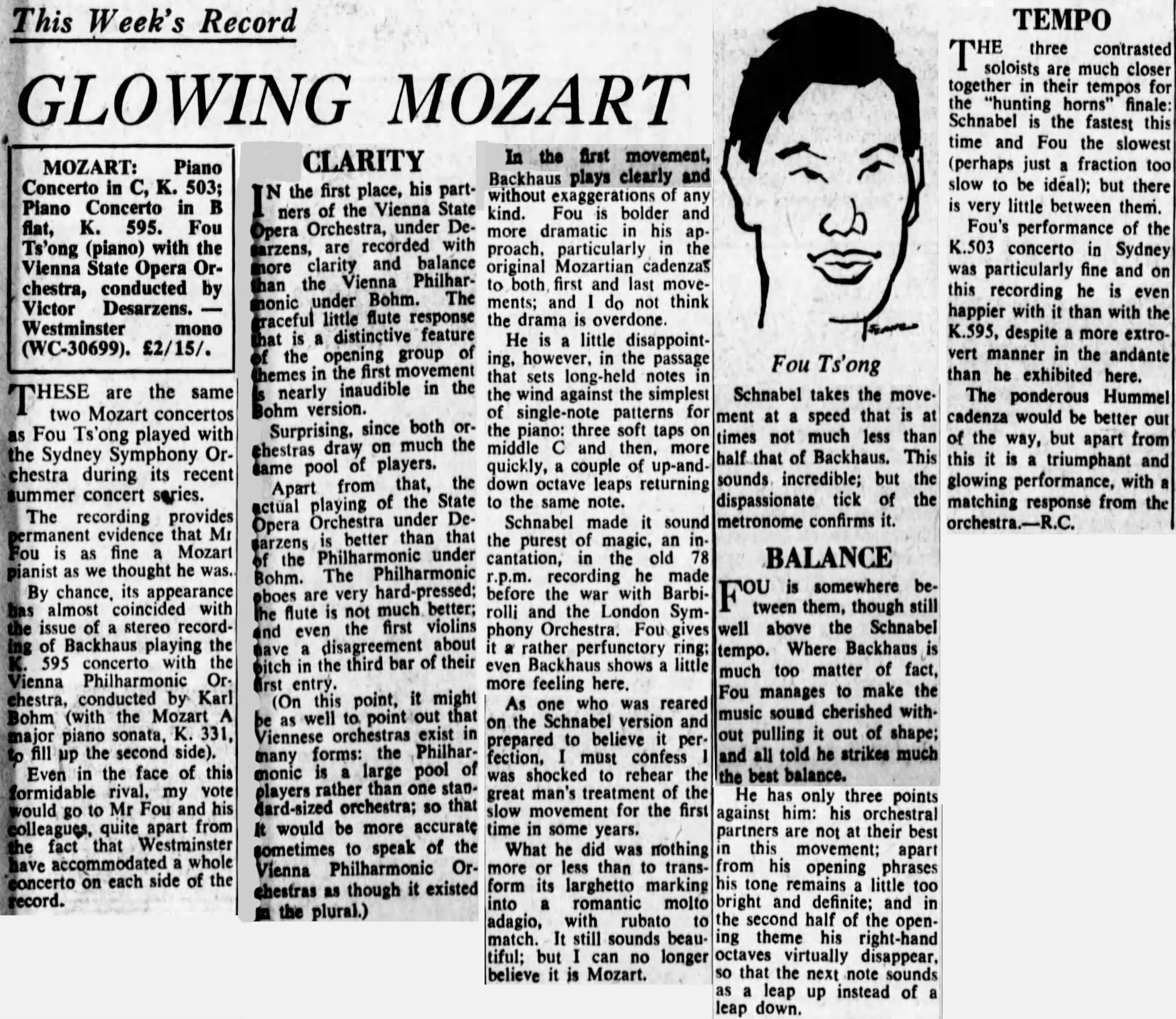 Wolfgang Amadeus Mozart, Concerto pour piano et orchestre No 25 en ut majeur, KV 503, Fou Ts'ong, piano, Orchestre de l'Opéra d'État de Vienne, Victor Desarzens, novembre 1960, Salle Mozart du «Konzerthaus» de Vienne