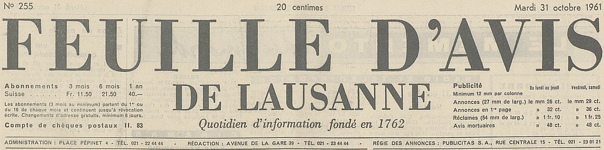 Francis Poulenc remporta un succès très vif en jouant son Concerto avec Jacques Février. L’oeuvre, en revanche, ne nous a pas convaincu... Victor Desarzens la défendit avec une belle ardeur. Les souffleurs de l’OCL, renforcés pour le Concerto, se distinguèrent, notamment les bois, accompagnés des violoncelles, dans les Préludes de Satie. Jean-Cl. Jaccard [...]" compte-rendu publié dans la Feuille d'Avis de Lausanne du mardi 31 octobre 1961, en page 11.
