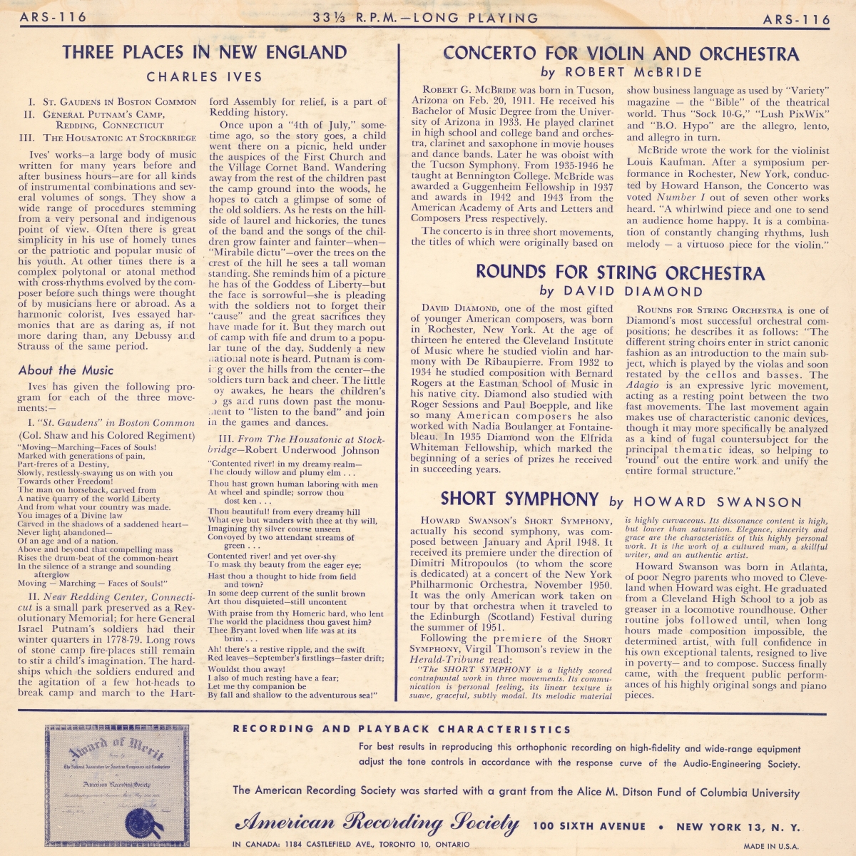 Traduit des notes publiées au verso de la pochette du disque American Recording Society ARS 116: