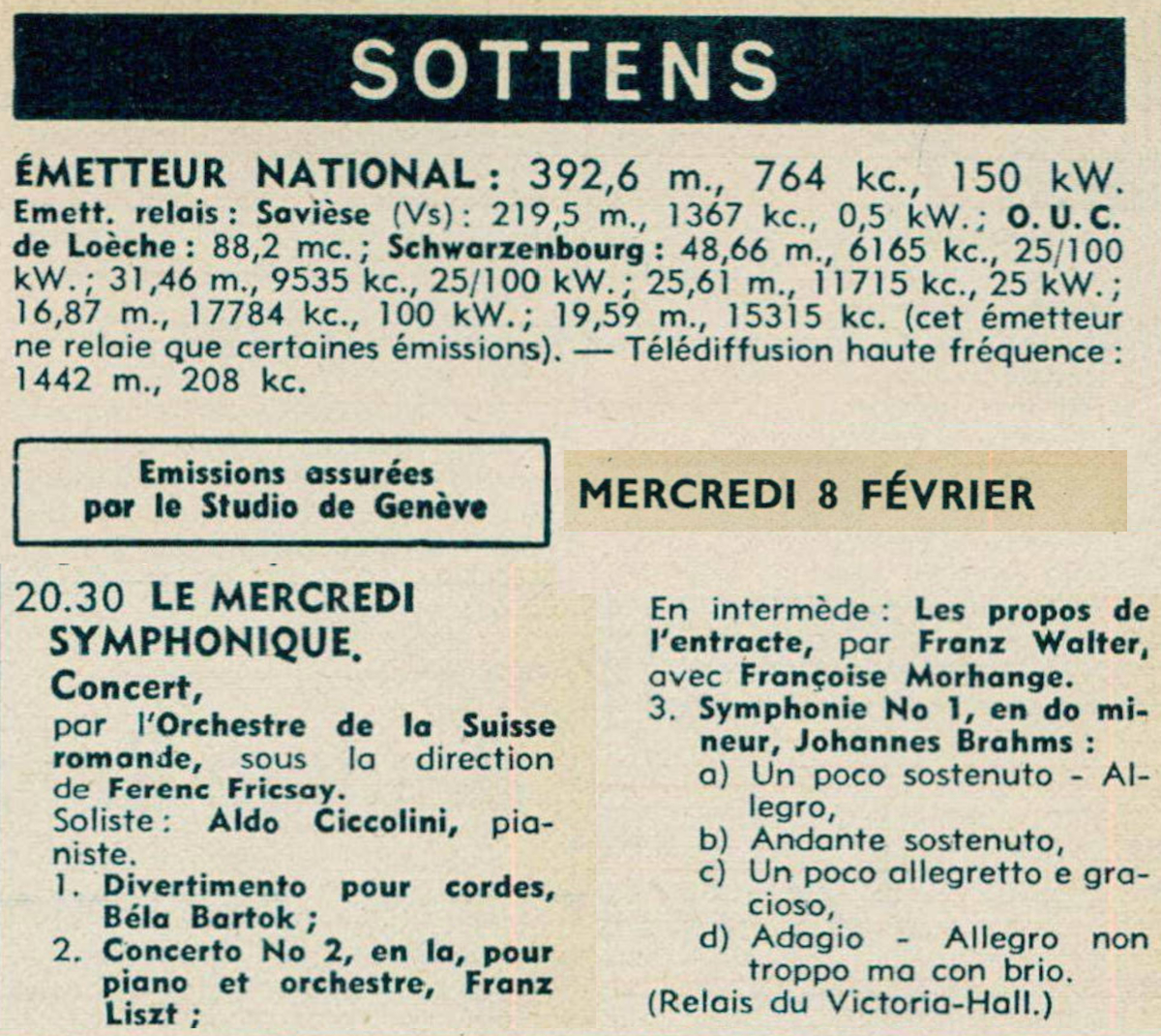 Voir cette page de mon site pour une courte présentation de Ferenc FRICSAY et de ce concert - telle que publiée par William RIME dans la revue Radio Je vois tout du 2 février 1956 en page 37 - ainsi que le compte-rendu de Franz WALTER publié le lendemain du concert dans le journal de Genève en page 8.