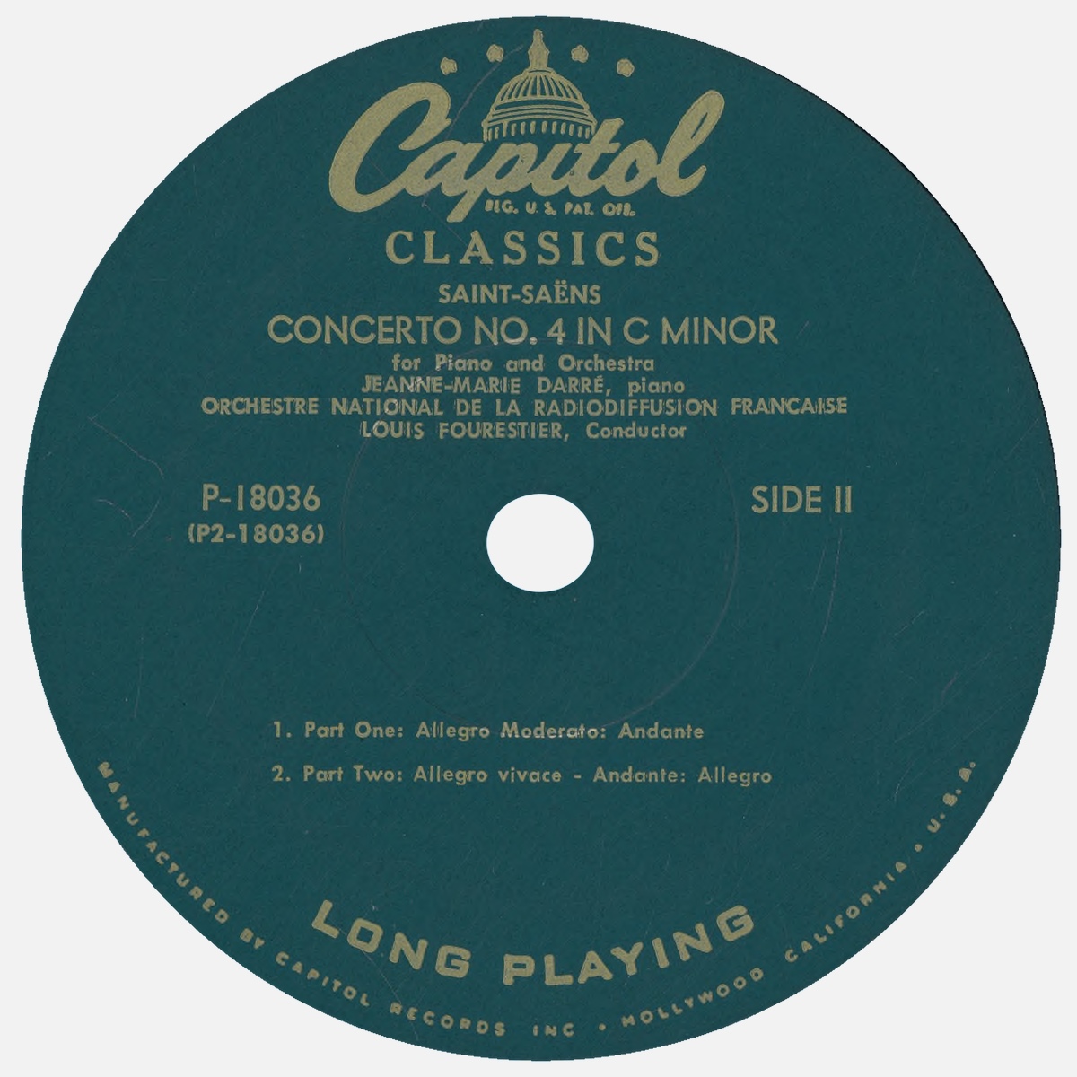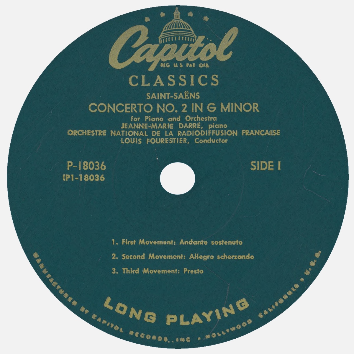 Enregistrés les 28 et 29 avril 1955, Maison de la Mutualité à Paris, sous la direction de Louis FOURESTIER, ces deux concertos de Saint-Saëns réunissaient Jeanne-Marie DARRÉ et l'Orchestre National de la Radiodifusion Française. Ils furent publiés sur le disque Pathé DTX 176 (les mêmes interprètent enregistrèrent l'année suivante les concertos No 1 et No 3 - DTX 222 -, puis le concerto No 5 en 1957 - DTX 252, disque complété avec le Septuor en mi bémol majeur pour piano, trompette, quatuor à cordes et contrebasse).
