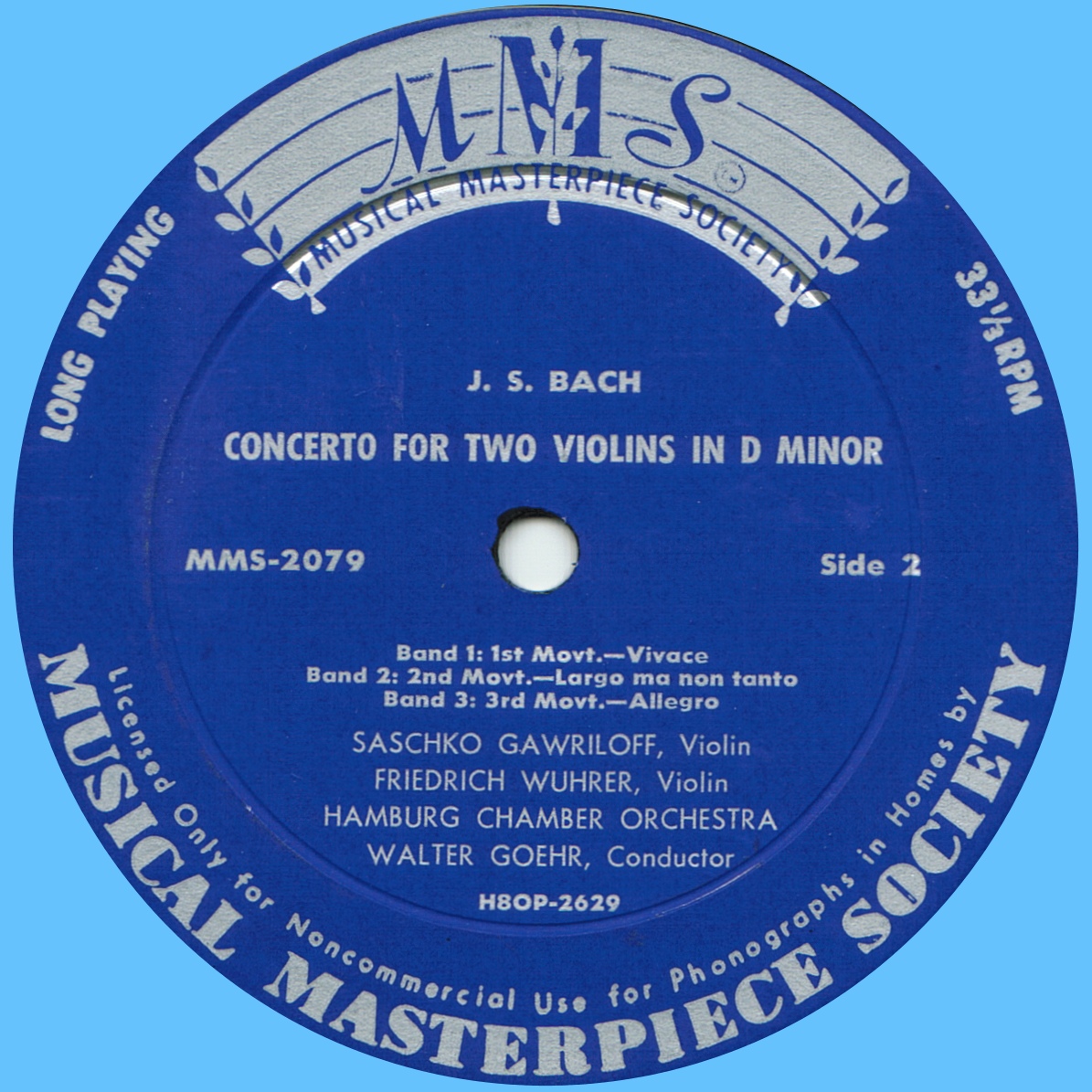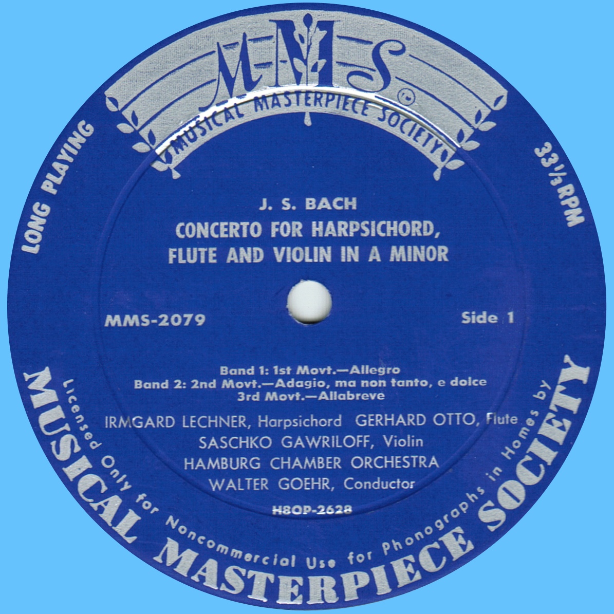Walter GOEHR enregistra cette oeuvre pour le label «Musical Masterpiece Society» avec Saschko GAWRILOFF, violon, Gerhard OTTO, flûte, Irmgard LECHNER, clavecin, et le «Hamburger Kammerorchester»: cet orchestre avait été fondé en 1950 par Hans-Jürgen WALTHER; il se nommait d'abord «Junge Hamburger Kammerorchester», puis à partir de 1952 simplement «Hamburger Kammerorchester». La concurrence entre les divers orchestres de Hamburg de ces années d'après-guerre était toutefois très marquée: c'est pourquoi le «Hamburger Kammerorchester» et le «Hamburger Symphonieorchester» décident en 1957 de travailler ensemble - une décision qui provoqua le départ de Hans-Jürgen Walther, chef-fondateur de l'orchestre: voir cette page de mon site pour plus de précisions.