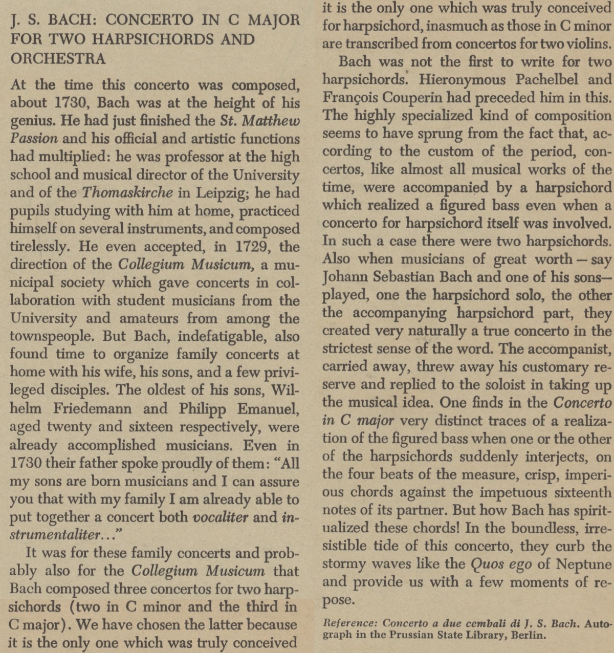 Johann Sebastian Bach, Concerto pour deux clavecins et orchestre en ut majeur, BWV 1061, Ruggero Gerlin, Marcelle Charbonnier, clavecin, Orchestre, direction artistique Curt Sachs, 1936