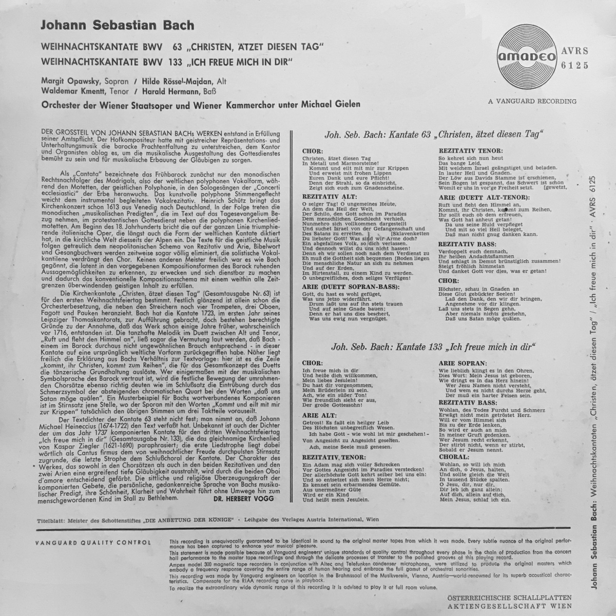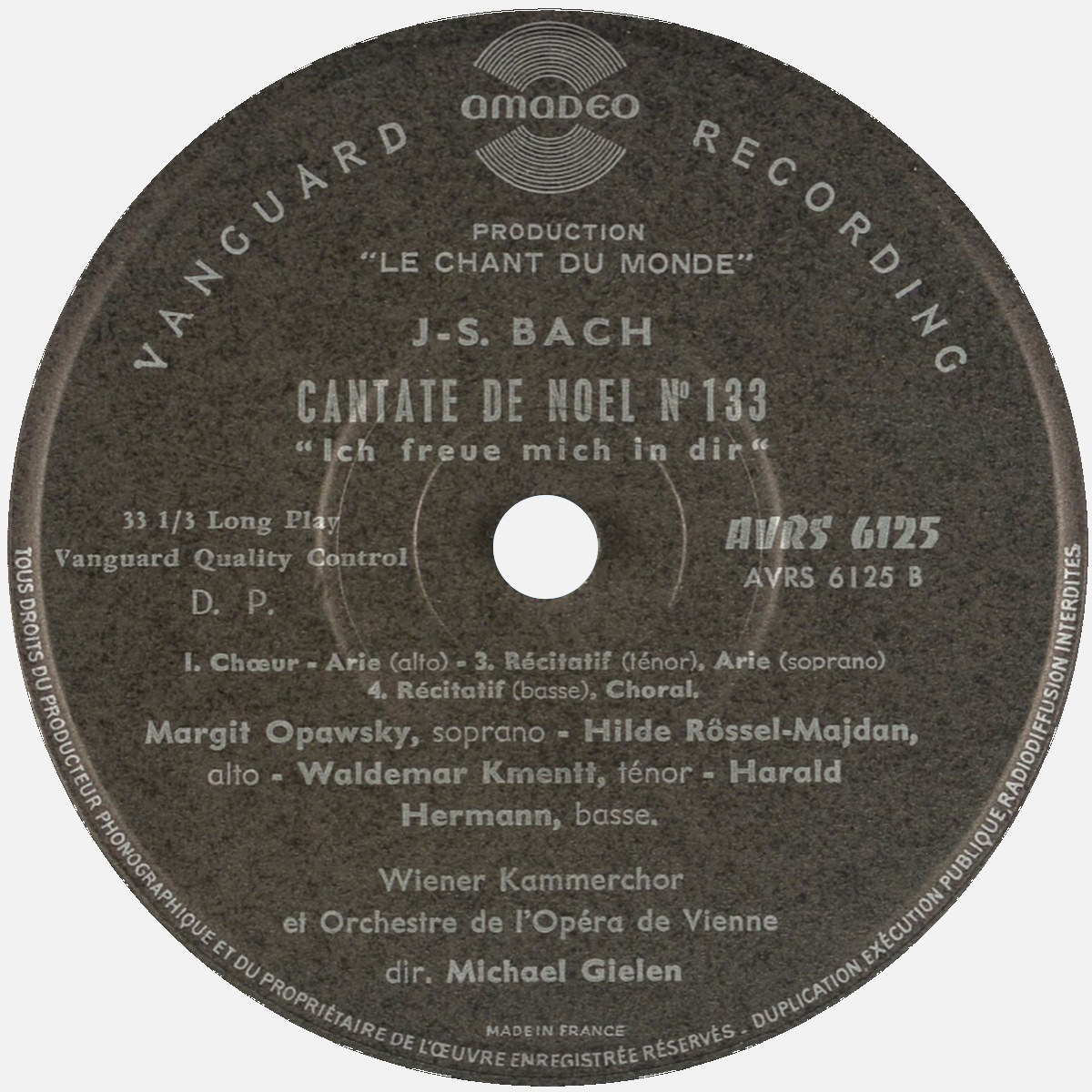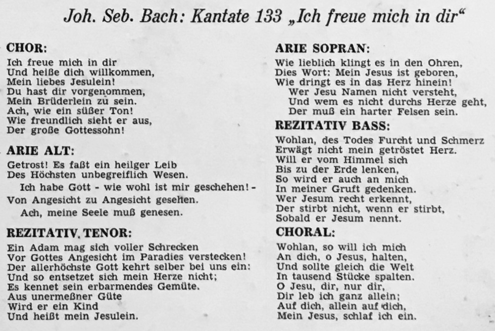 On ne connaît pas le poète de cette cantate pour le troisième jour de Noël «Ich freue mich in dir», „Je me réjouis en toi“, BWV 133, composée vers l'an 1737, qui paraphrase le cantique du même nom de Kaspar Ziegler (1621-1690); la première strophe du cantique sert littéralement de cantus firmus à la phrase de tête, qui vibre de la joie de Noël, et la dernière strophe au choral final de la cantate. Le caractère de l'oeuvre, qui rayonne d'une foi profonde et émouvante aussi bien dans les mouvements du choeur que dans les deux récitatifs et les deux arias, est fortement coloré par les deux hautbois d'amour. La force de conviction morale et religieuse des prières composées, le langage personnel et riche en pensées de la prédication musicale de Bach, sa beauté, sa clarté et sa vérité nous conduisent sans détours vers l'enfant incarné dans l'étable de Bethléem.