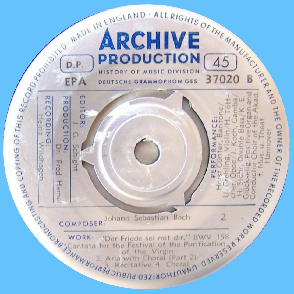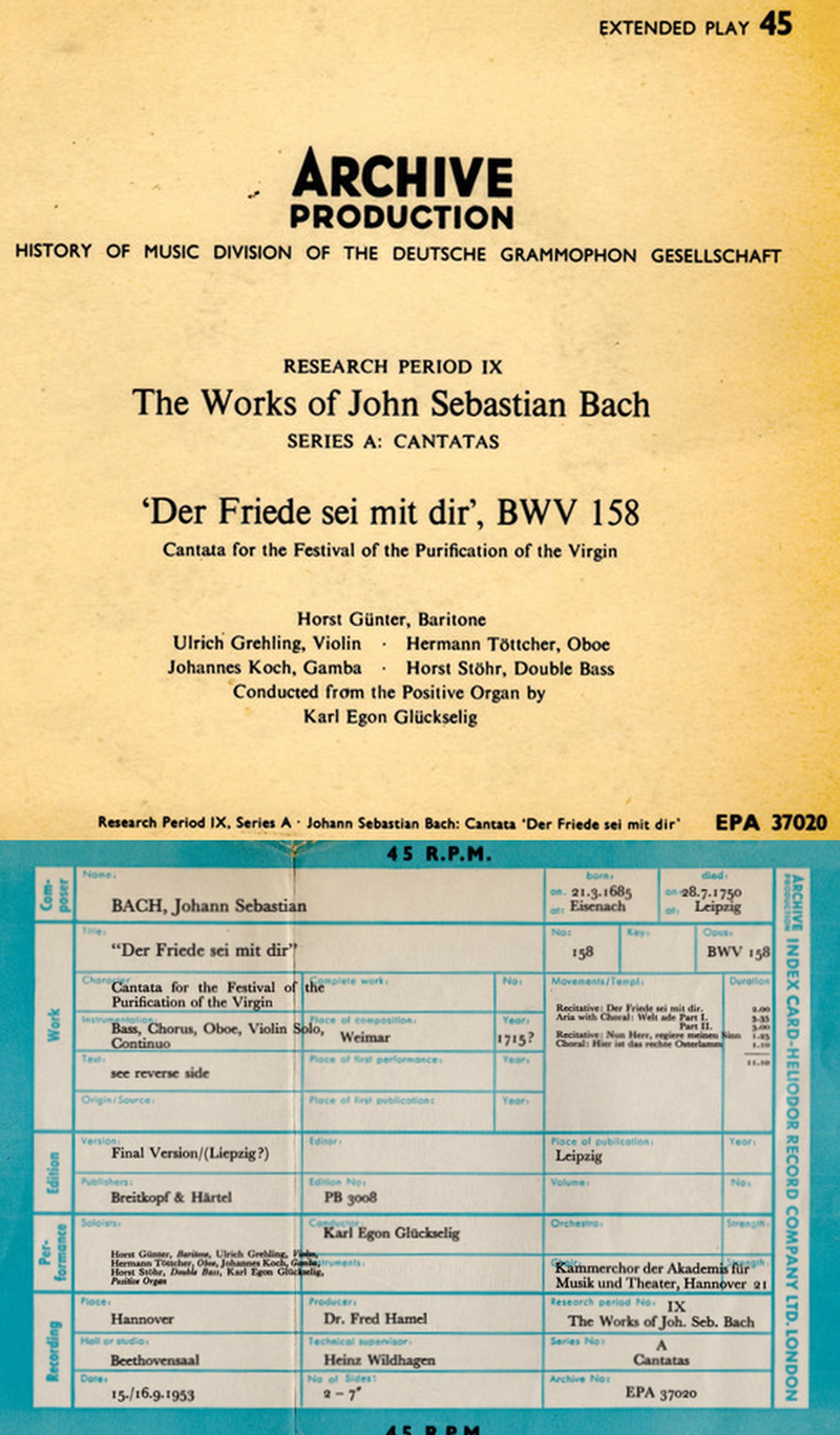 Johann Sebastian Bach, «Der Friede sei mit Dir», «Que la Paix soit avec toi», Cantate BWV 158, Horst Günter, baryton, Ulrich Grehling, violon, Hermann Töttcher, hautbois, Johannes Koch, viole de gambe, Horst Stöhr, contrebasse, le Kammerchor der Akademie fur Musik und Theater, Hannover 21, Karl Egon Glückselig (orgue et direction), 15 et 16 septembre 1953, Beethovensaal, Hannover
