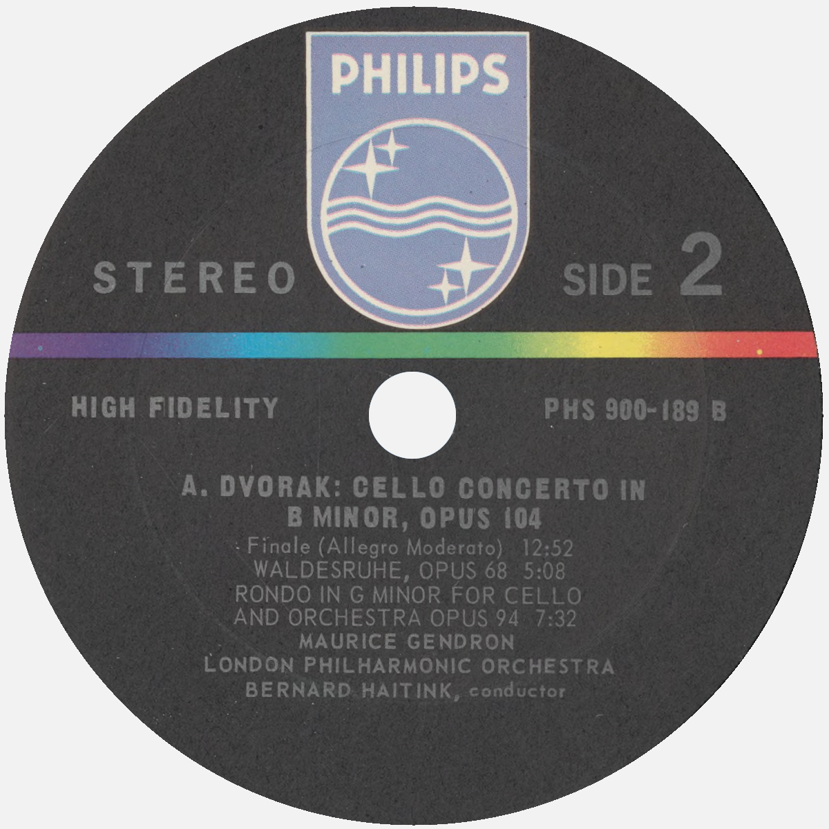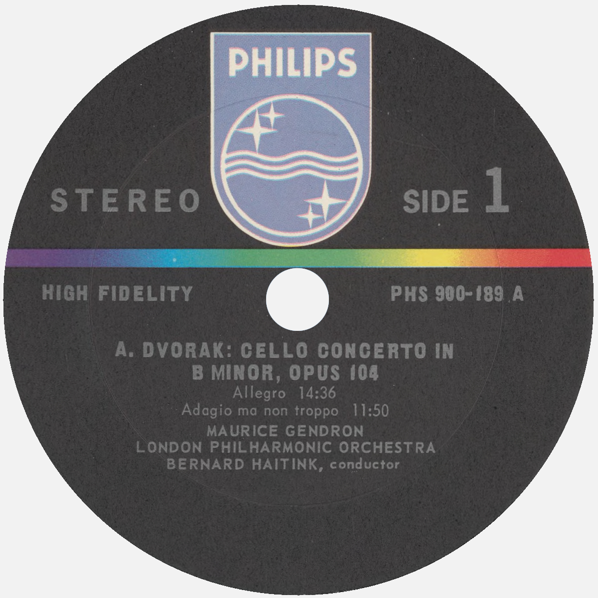 Les 14 et 15 novembre 1967, dans le Brent Town Hall de Londres, l'Orchestre Philharmonique de Londres sous la direction de Bernard HAITINK et avec Maurice GENDRON en soliste au violoncelle enregistrèrent les trois oeuvres pour violoncelle et orchestre d'Antonín DVOŘÁK publiées sur ce disque Philips PHS 900 189.