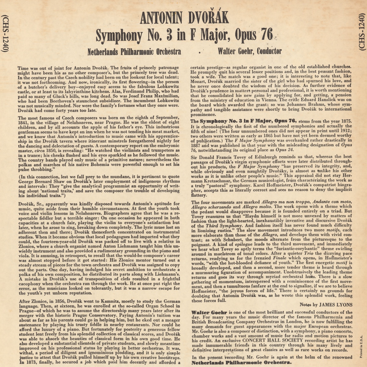 "[...] The Symphony No. 3 in F Major, Opus 76, stems from the year 1875. It is chronologically the first of the numbered symphonies and actually the fifth of nine! (The four unnumbered ones did not appear in print until 1912; two others were written as early as 1865 but have not yet been deemed worthy of publication.) The F Major Symphony was overhauled rather drastically in 1887 and was published in that year with the misleading designation of Opus 76, notwithstanding its original place as Opus 24.[...]" cité du texte de James LYONS publié au verso de la pochette du disque CHS 1240 (qui est identique à celui publié au verso de la pochette du disque Concert Hall G-2).