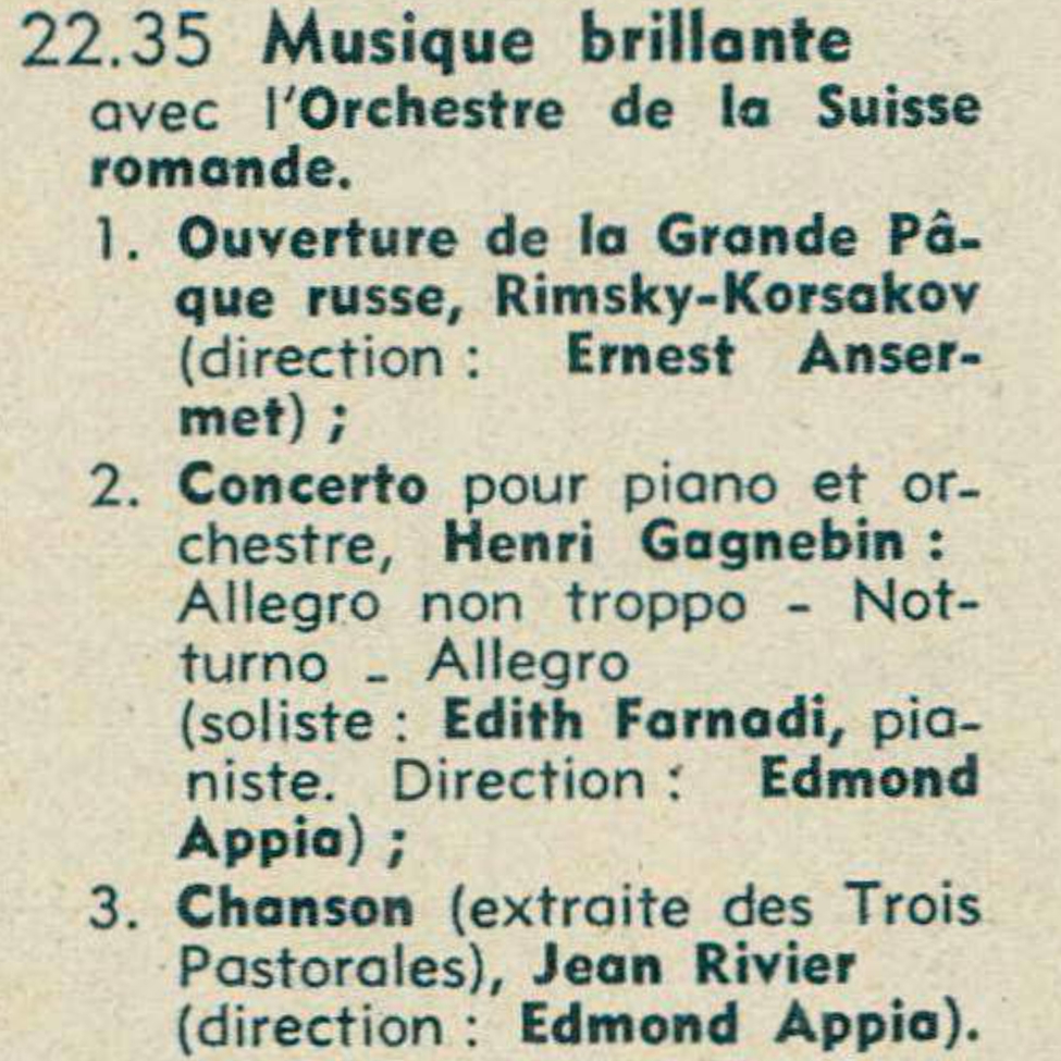 Henri GAGNEBIN, Concerto pour piano et orchestre (1931), Edith FARNADI, Orchestre de la Suisse Romande, Edmond APPIA