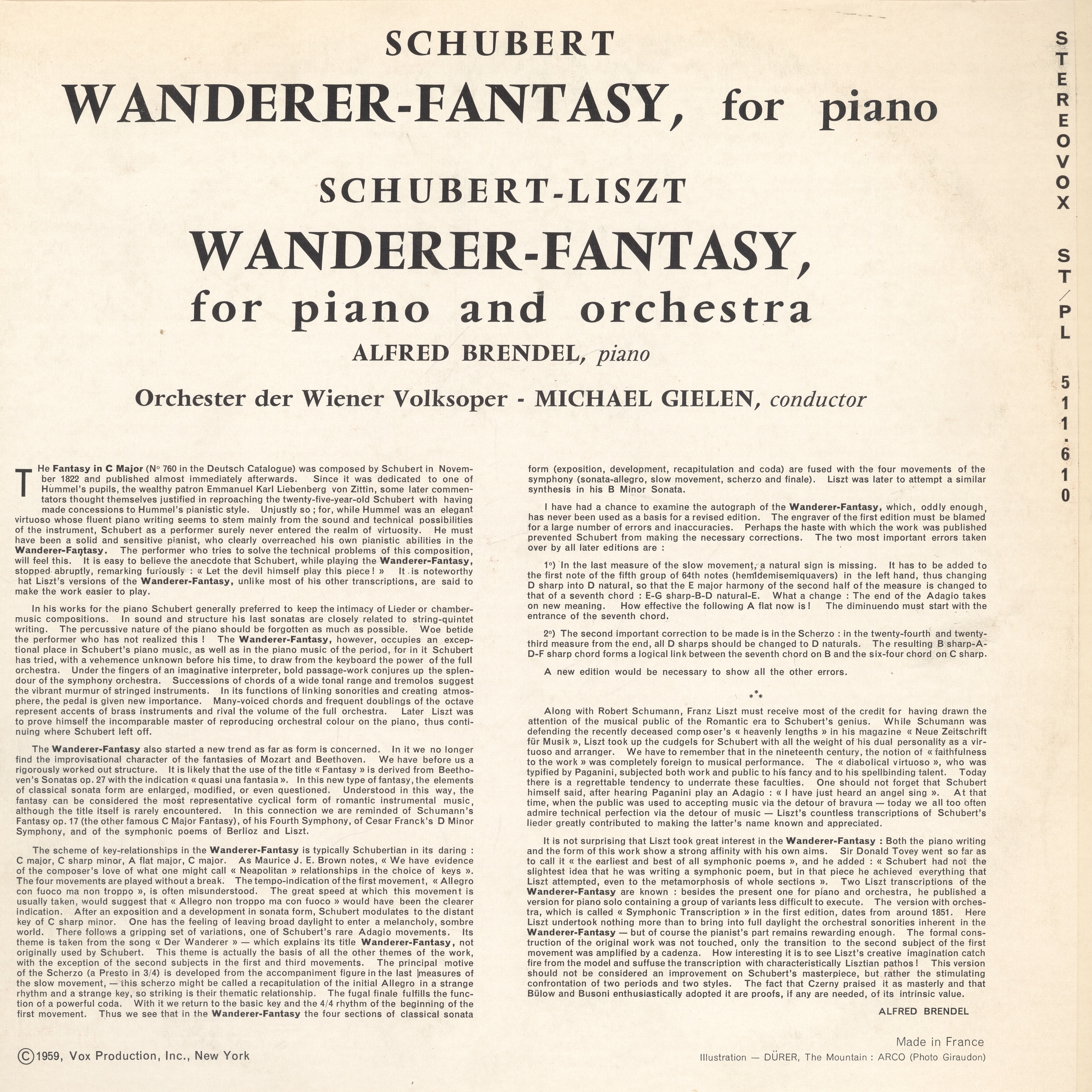 Ce disque consacré à la «Wanderer-Fantasie» de Franz SCHUBERT fut enregistré pour le label VOX le 8 avril 1959 dans la Grande Salle du «Musikverein» de Vienne, avec le jeune Alfred BRENDEL au piano et l'Orchestre de l'Opéra populaire de Vienne, le tout sous la direction du presque tout aussi jeune Michael GIELEN - qui avait fait ses débuts de chef d'orchestre à Vienne cinq ans auparavant, après avoir été «Chorrepetitor» à l'Opéra de Vienne de 1950 à 1951, tout en achevant ses études.