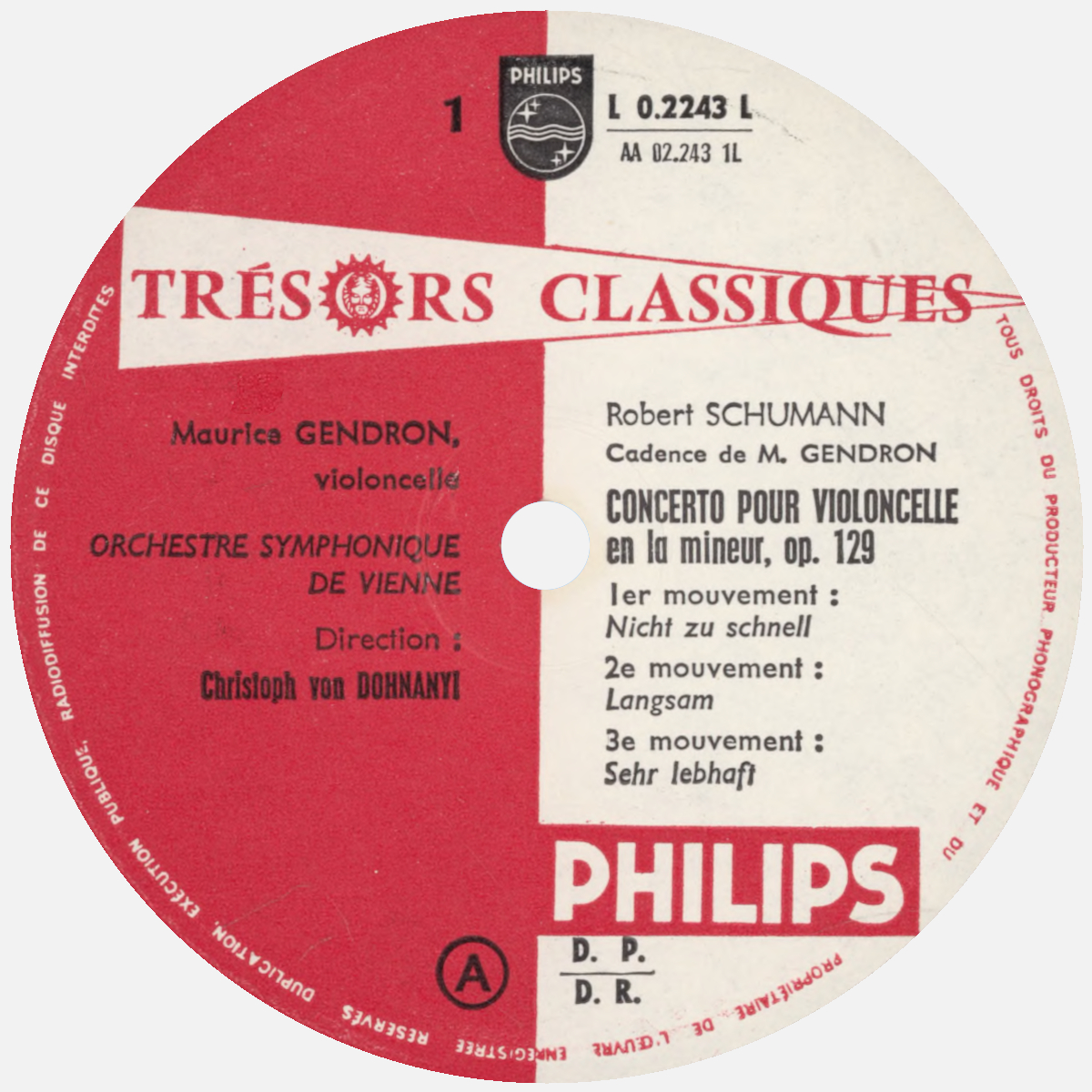 Pour le label Philips, dans des sessions qui s'étendirent du 19 au 22 février 1962 dans la Grande Salle de la Maison de l’Union Musicale de Vienne, l'Orchestre Symphonique de Vienne sous la direction de Christoph von DOHNANYI et Maurice GENDRON - en soliste au violoncelle - enregistrèrent trois oeuvres pour violoncelle et orchestre de Robert SCHUMANN et de Peter TSCHAIKOWSKI, qui furent publiées sur ce disque de l'album Philips-L-02-243-L: